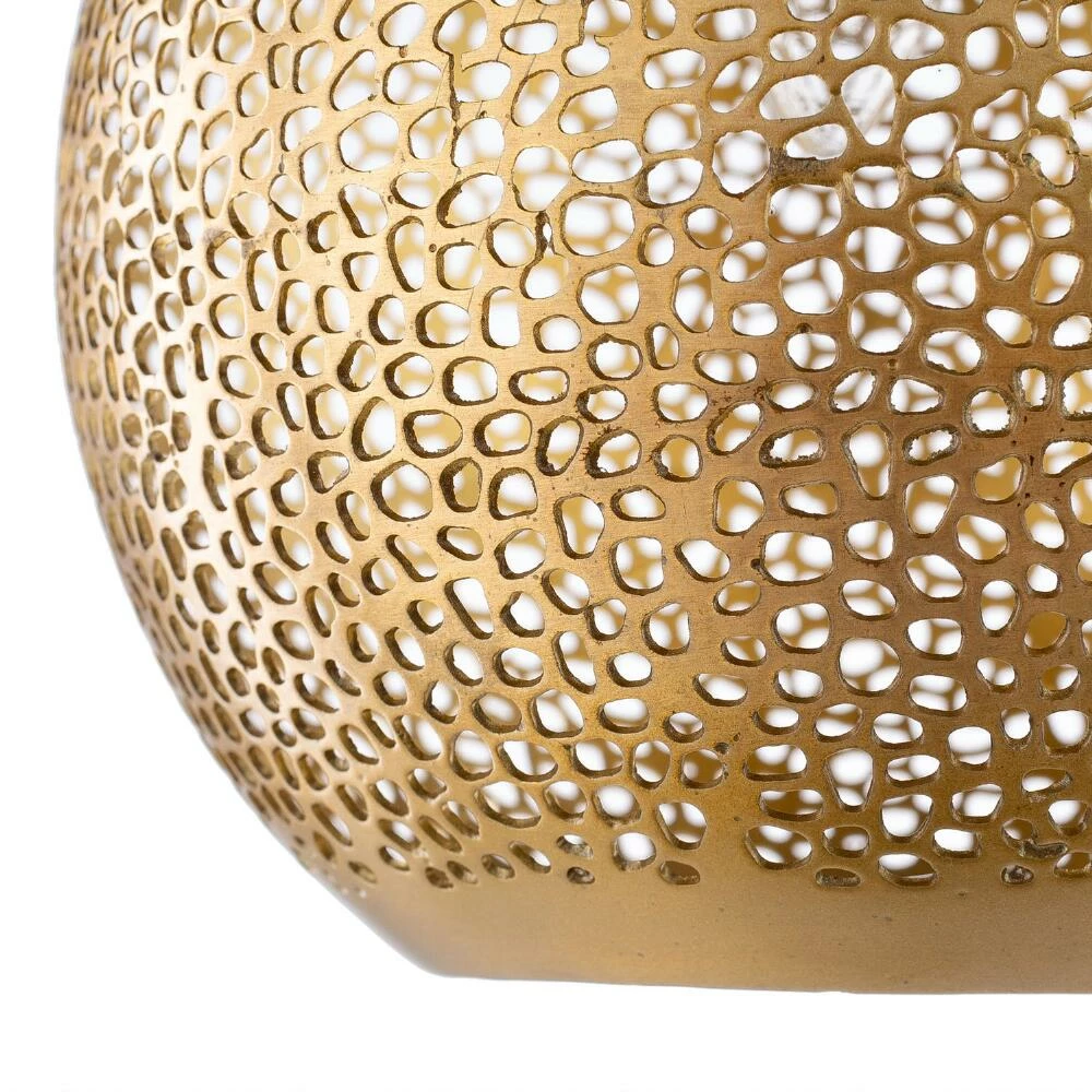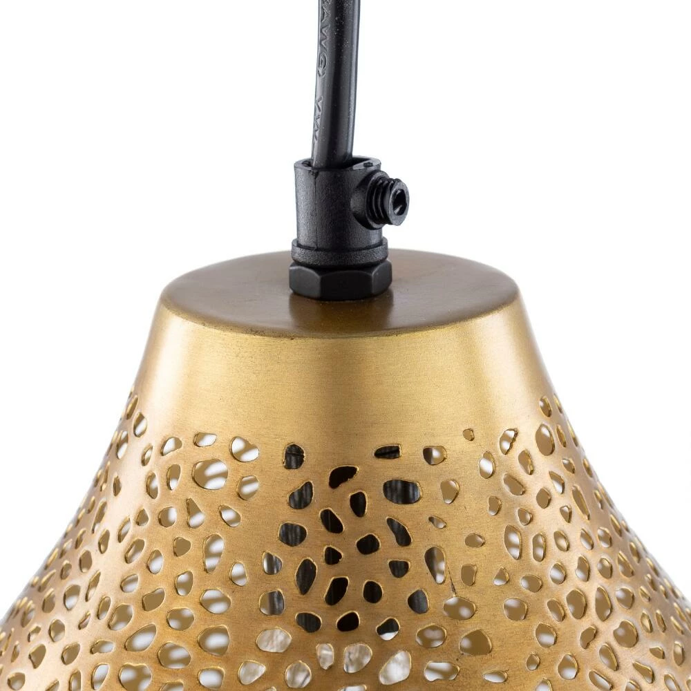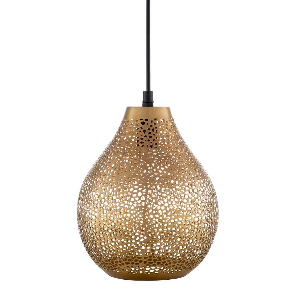 A mini teardrop hanging lamp with a luxe gold finish, the Adelaide pendant from Surya is filled with geometric piercings that allow light to pour through and scatter in all directions. Illuminating with a warm, golden glow, its open base directs soft light downwards in small spaces anywhere in the home.