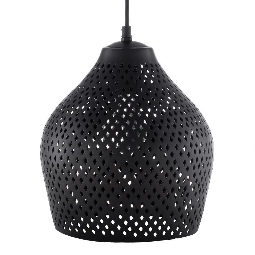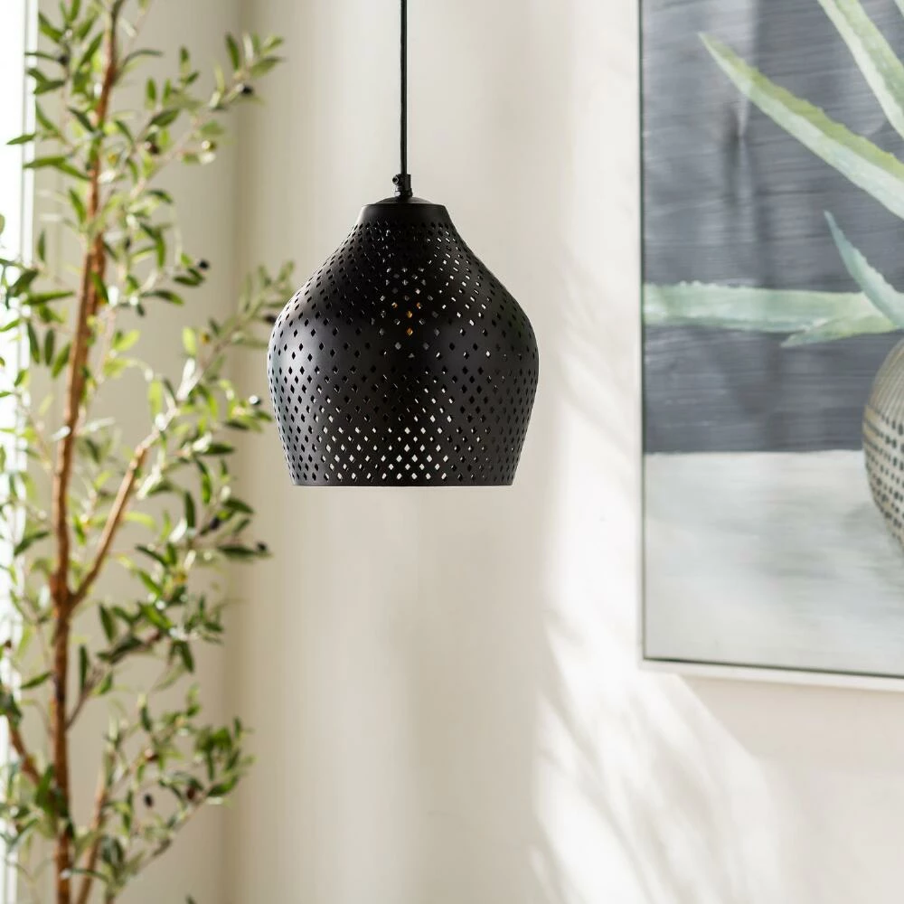 Crafted of metal by expert artisans in India, the Adelaide modern pendant lamp from Surya features a teardrop silhouette with diamond-patterned piercings. Its open base is ideal for directing soft light downwards in kitchens, hallways and small spaces. Available in a choice of colors, this hanging pendant light is finished by hand in dramatic black or burnished copper.