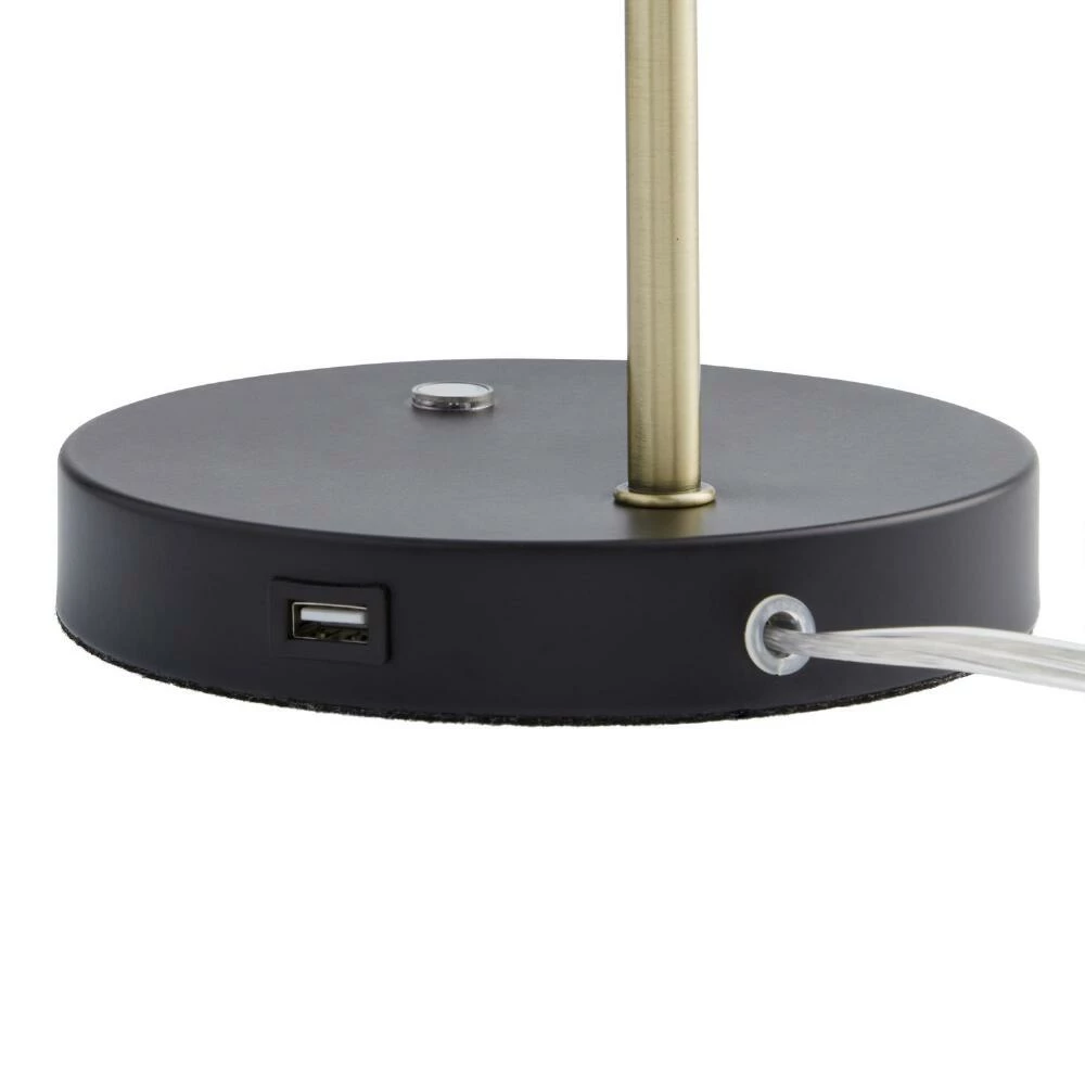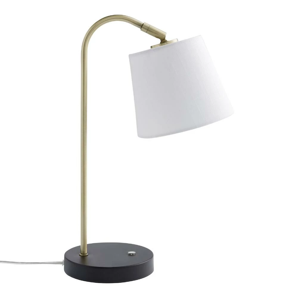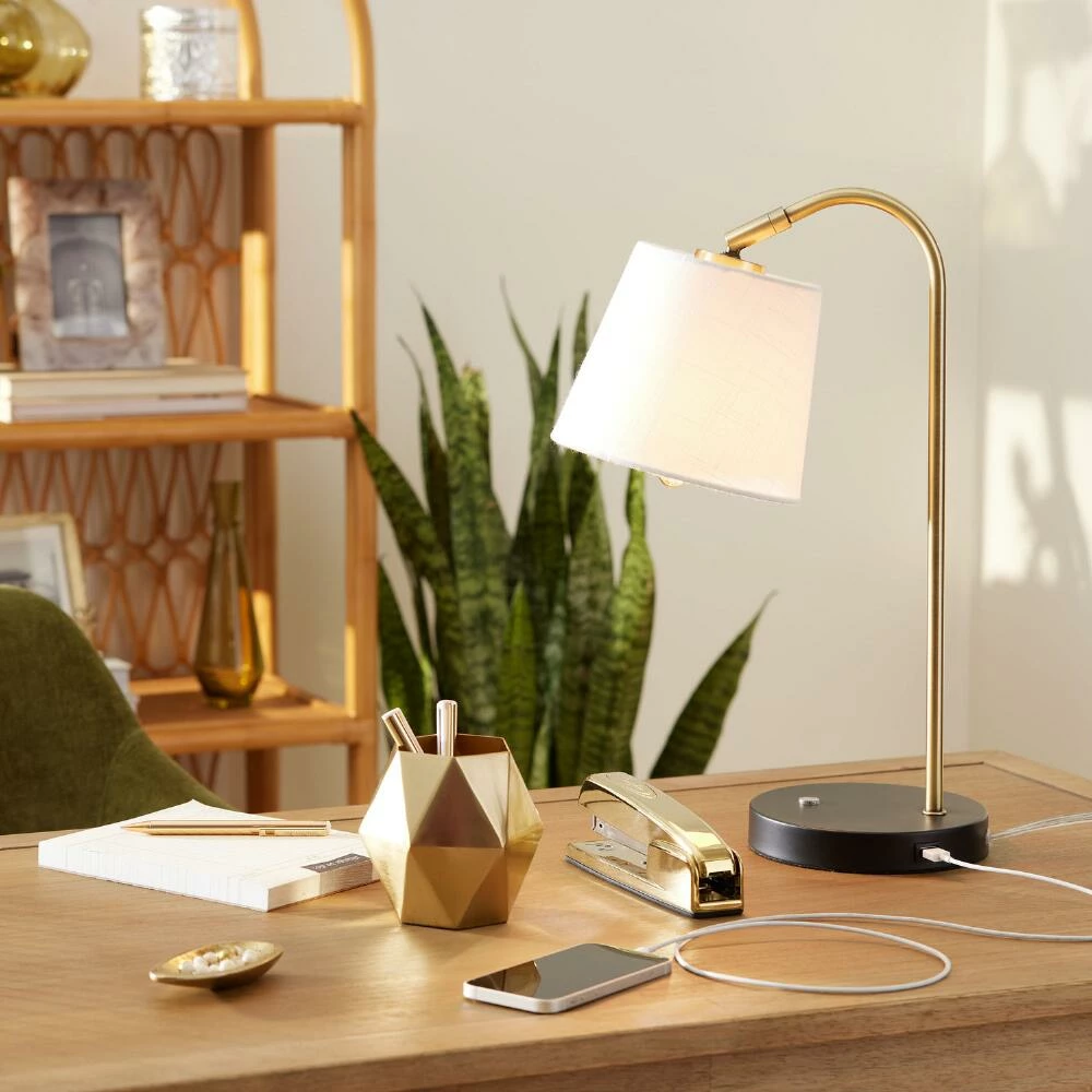 Our exclusive Aida desk lamp features a pivoting white-linen task shade, a gold-metal neck and compact black base with a USB port. Turning on and off with a satisfying soft-touch light switch, this mixed-material task lamp adjusts to shine light where you need it most while keeping your smartphone or tablet charged up. Easy to place anywhere, it brings stylish convenience to small surfaces with its splendid three-tone design.
