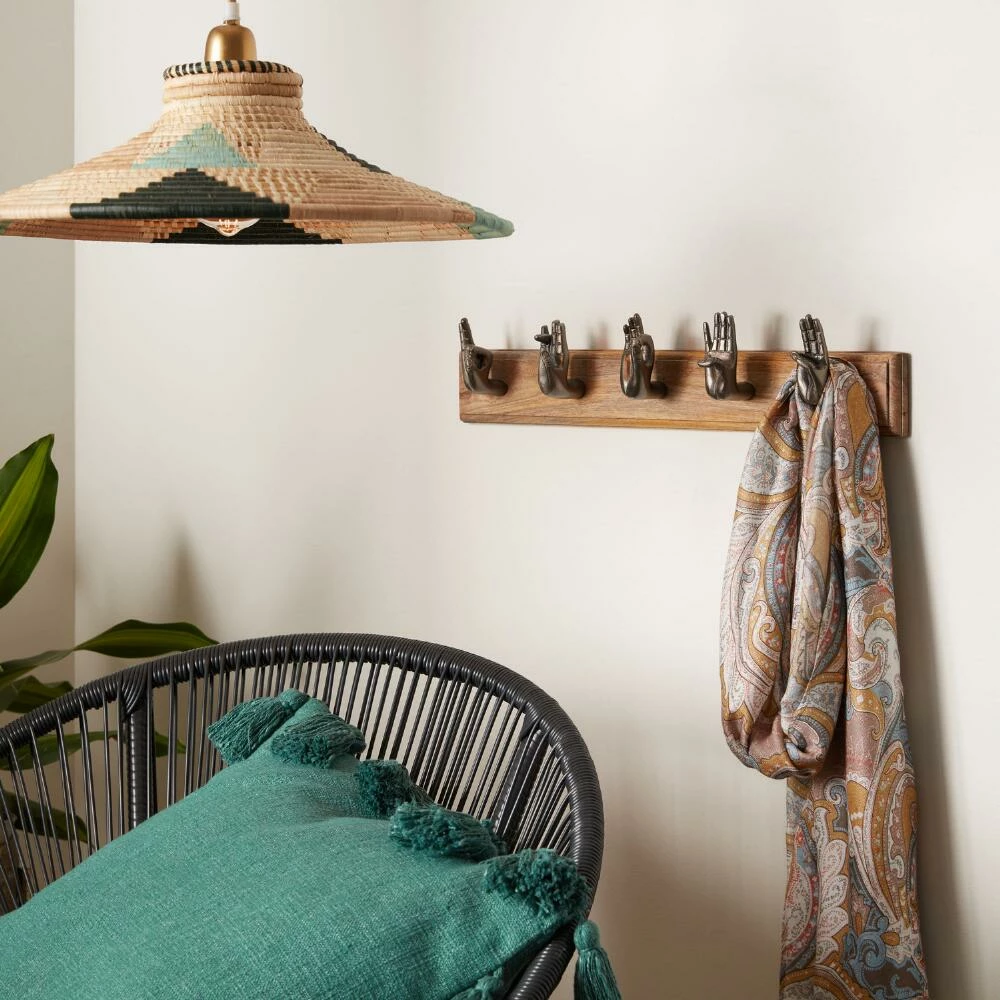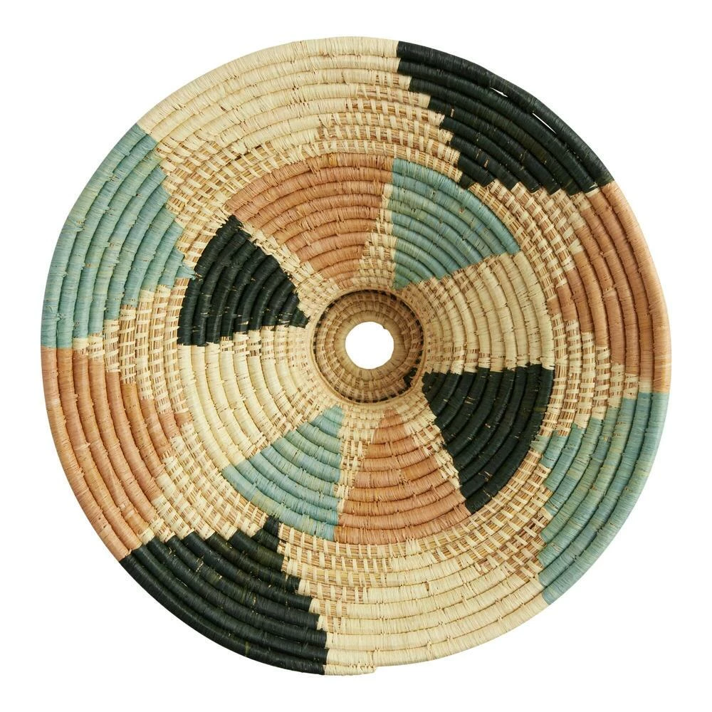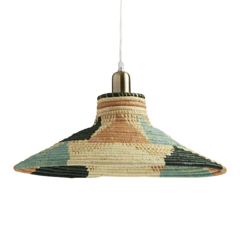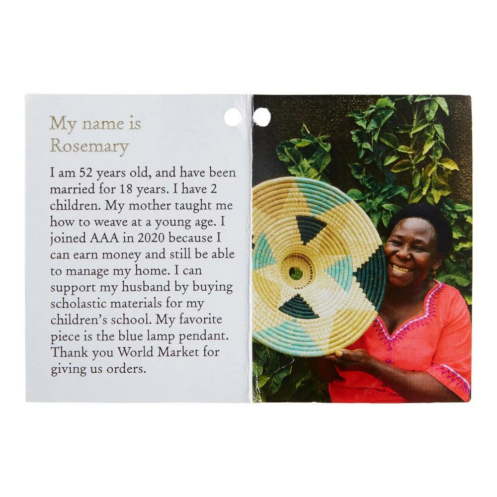 Illuminate your space with this woven raffia pendant lamp decorated with a teal, pink and black sunray motif. Handcrafted by women artisans in Uganda, this piece captures variations unique to each craftsperson’s hand. It’s made by artisans employed under All Across Africa, whose mission aims to alleviate poverty and empower artisans by creating sustainable jobs that allow them to invest in education, housing, food, healthcare and families.