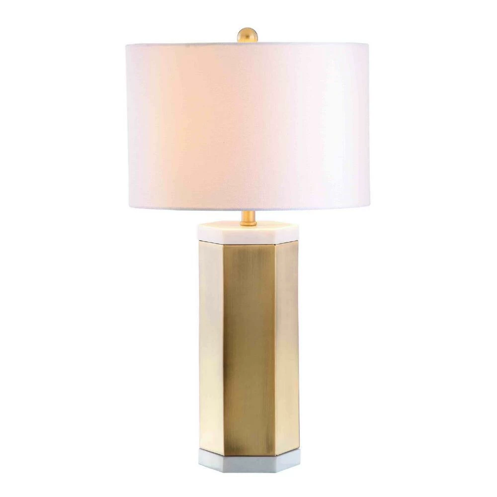 A cylindrical hexagon-shaped body, lustrous gold finish and white marble accents give the Alya table lamp its look of luxury. This modern accent lamp from Safavieh features a white cotton shade that diffuses light into a soft, ambience-enhancing glow.