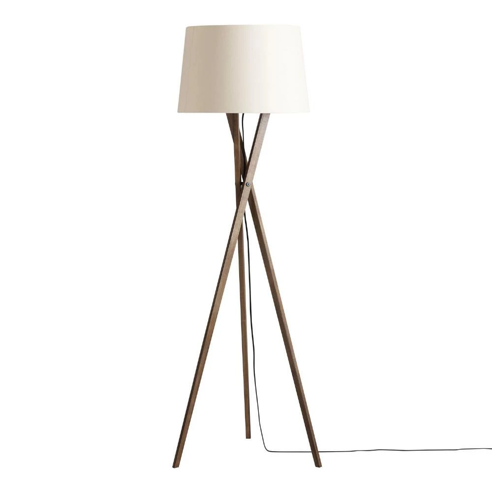 Crafted in the Philippines with three rich walnut-finished legs, our mid-century-style floor lamp is cleverly assembled to give the illusion of a twisting base. With its wooden tripod silhouette and tapered linen shade, this architectural lighting solution is ideal for a studio or workspace.