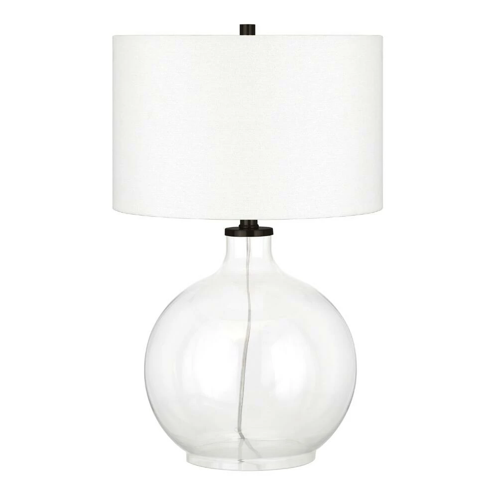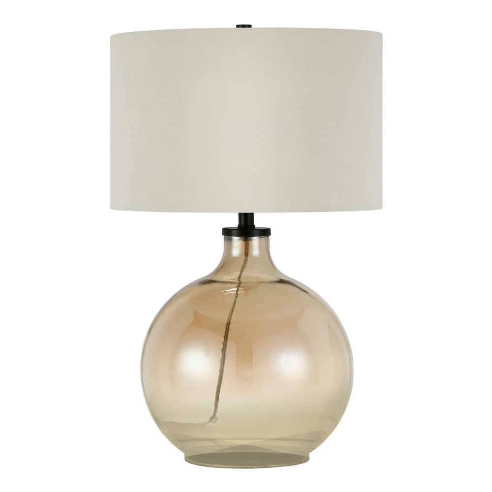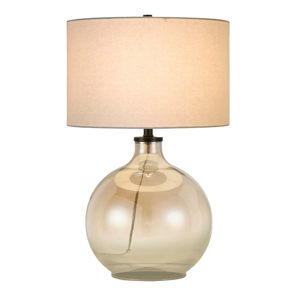The rounded silhouette of the Beatrice table lamp is crafted of fine glass, accented with metallic hardware and completed with a drum-shaped linen shade. Featuring three distinct styles to complement your space, it’s available in luminescent luster glass with shimmering amber tones that contrast with blackened-bronze hardware, or delicate and airy clear glass with hardware in warm golden brass or industrial-style blackened bronze.