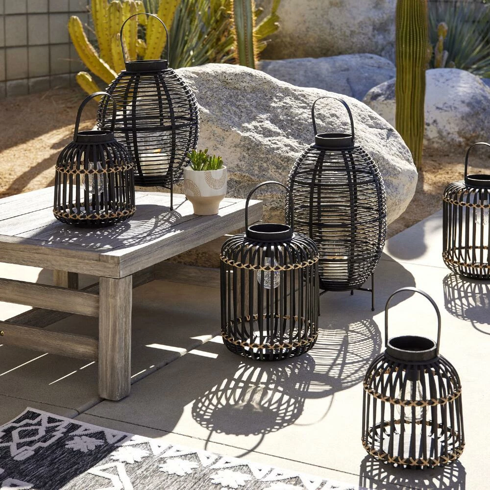Crafted of natural fiber finished in black with neutral-toned accents, our exclusive solar LED lantern casts a warm glow through its open, airy design. This brilliant outdoor light makes a chic decor piece in the daytime that transforms into a cool glowing beacon after dark. Available in two sizes, this charming solar light is perfect for decorating your outdoor entertaining area in multiples.