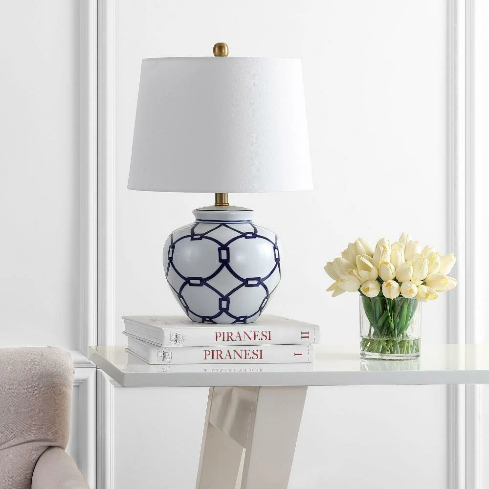 A blue geometric motif lends a modern edge to our table lamp. Crafted of white ceramic, this shapely piece features brass-gold accents that beautifully complete its contemporary color palette.