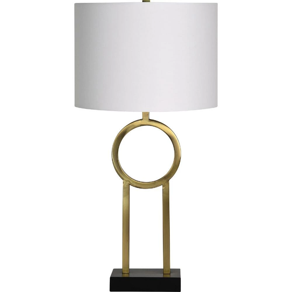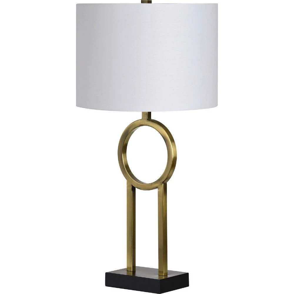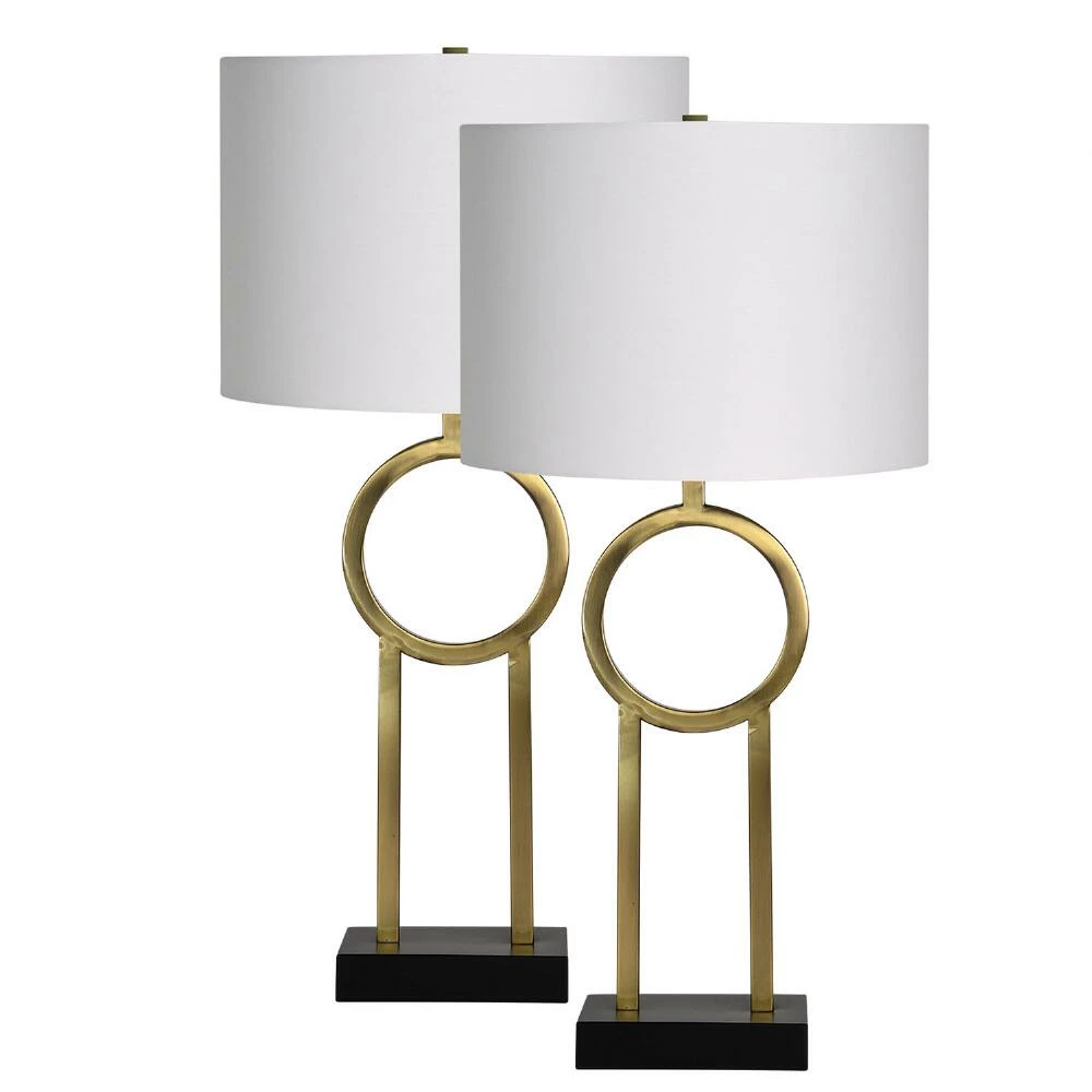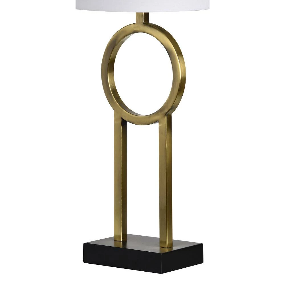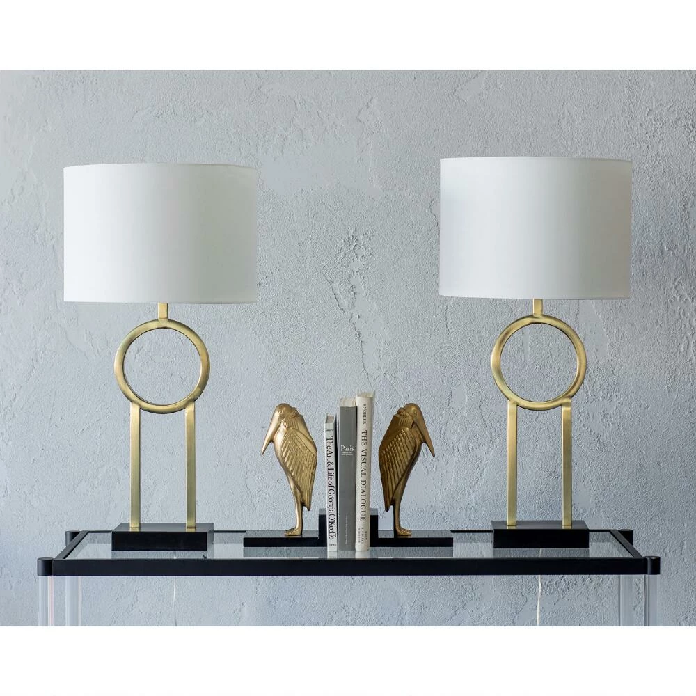 A perfect pair for contemporary nightstands or end tables, these Brayden lamps lend chic geometry and beautiful balance to your decor. Anchored by a solid black base, each one supports an open, eye-catching rectangle-and-circle structure finished in antique brass and topped with an off-white shade.