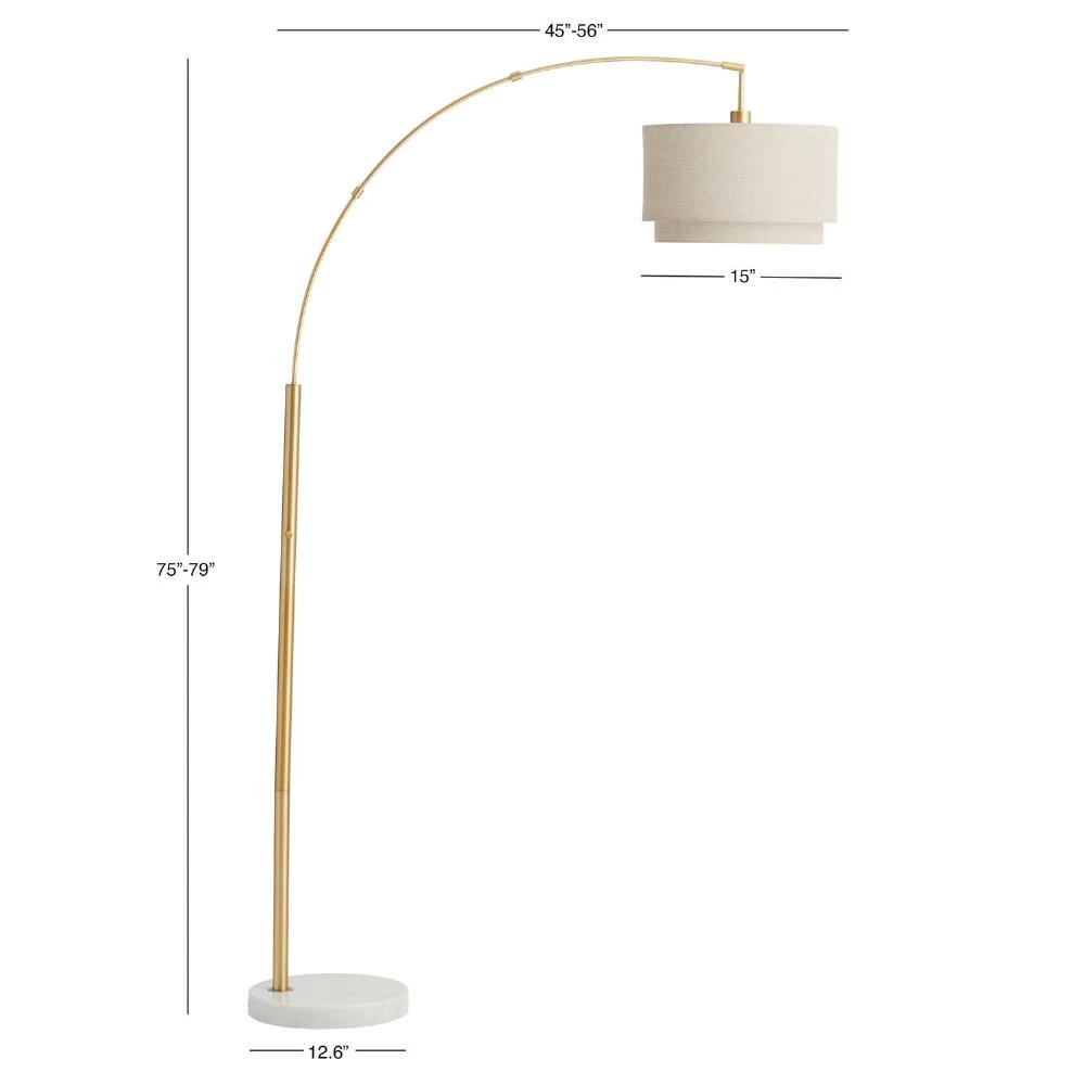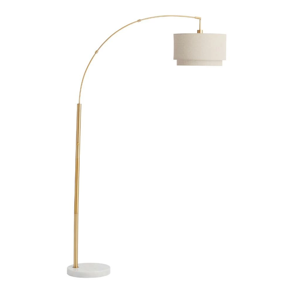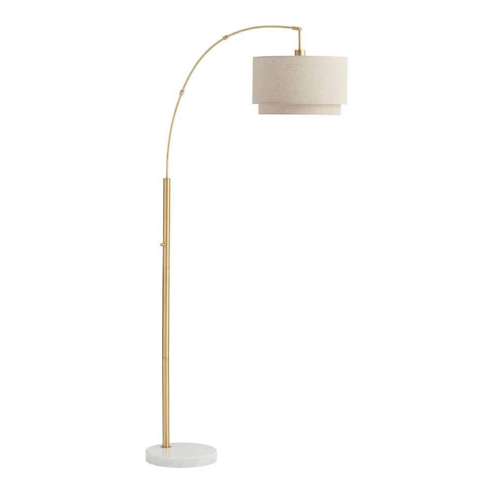 Featuring an adjustable brass-finished arm with a natural linen two-tier fabric shade anchored by a stunning white marble base, this mid-century-style floor lamp shines bright overhead light across any large space. Ideal for a studio, study or placed near your favorite reading chair, this arc lamp’s movable shade and sleek silhouette makes it a versatile lighting solution.