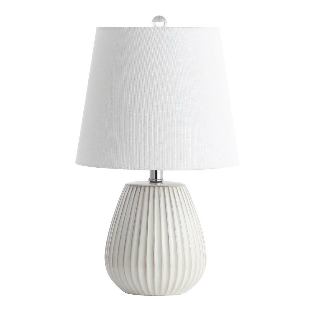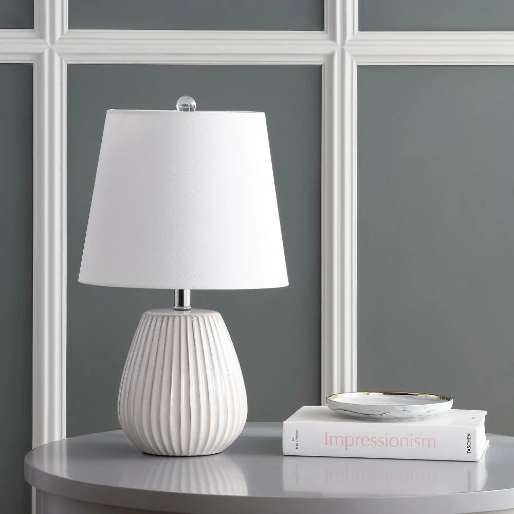 Ribbed detailing adds striking depth to the clean design of our white ceramic table lamps. Topped with white cotton shades and accented with chrome, these versatile light sources bring a modern touch to existing decor.
