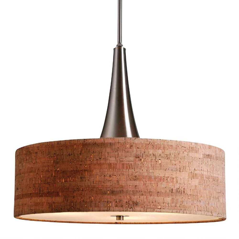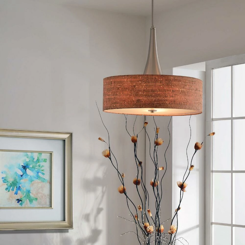 With a sleek brushed-steel trumpet base over a warm, natural-cork drum shade, our three-light pendant lamp is a fashionable update for any decor style. Featuring a diffuser to soften harsh glare and extension poles for an adjustable height, this versatile accent is perfect hanging over a dining table or in the kitchen.