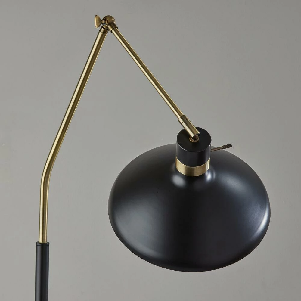 The Bryson metal floor lamp combines black and antique brass finishes for an industrial look. Featuring a clean-lined profile, this standing lamp is elegantly set on a clear glass base with metal trim. A sophisticated addition to a living room, bedroom or reading nook, this task-style floor lamp has an adjustable shade and arm that let you conveniently shine light wherever you need it.