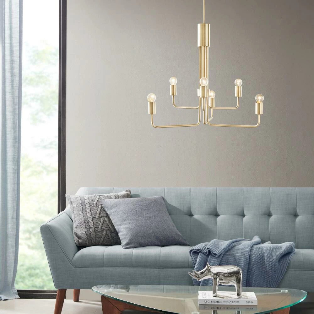 The modern Carol metal chandelier lends illumination and bold architectural appeal to your dining room, living space or entryway. Designed with antique brass-finished hardware and angular arms for a contemporary, clean-lined look, its unique 6-light silhouette becomes an instant focal point in any space.