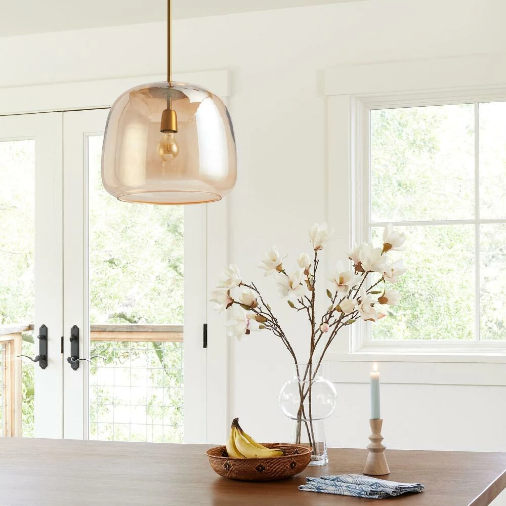 Exuding a vintage elegance, the shapely Cyra pendant lamp is handcrafted of mouth-blown glass tinted in a warm amber hue. A brass canopy completes the sophisticated look of this hanging light. Mount it in the dining room, living room or bedroom to enliven your space with its warm glow.