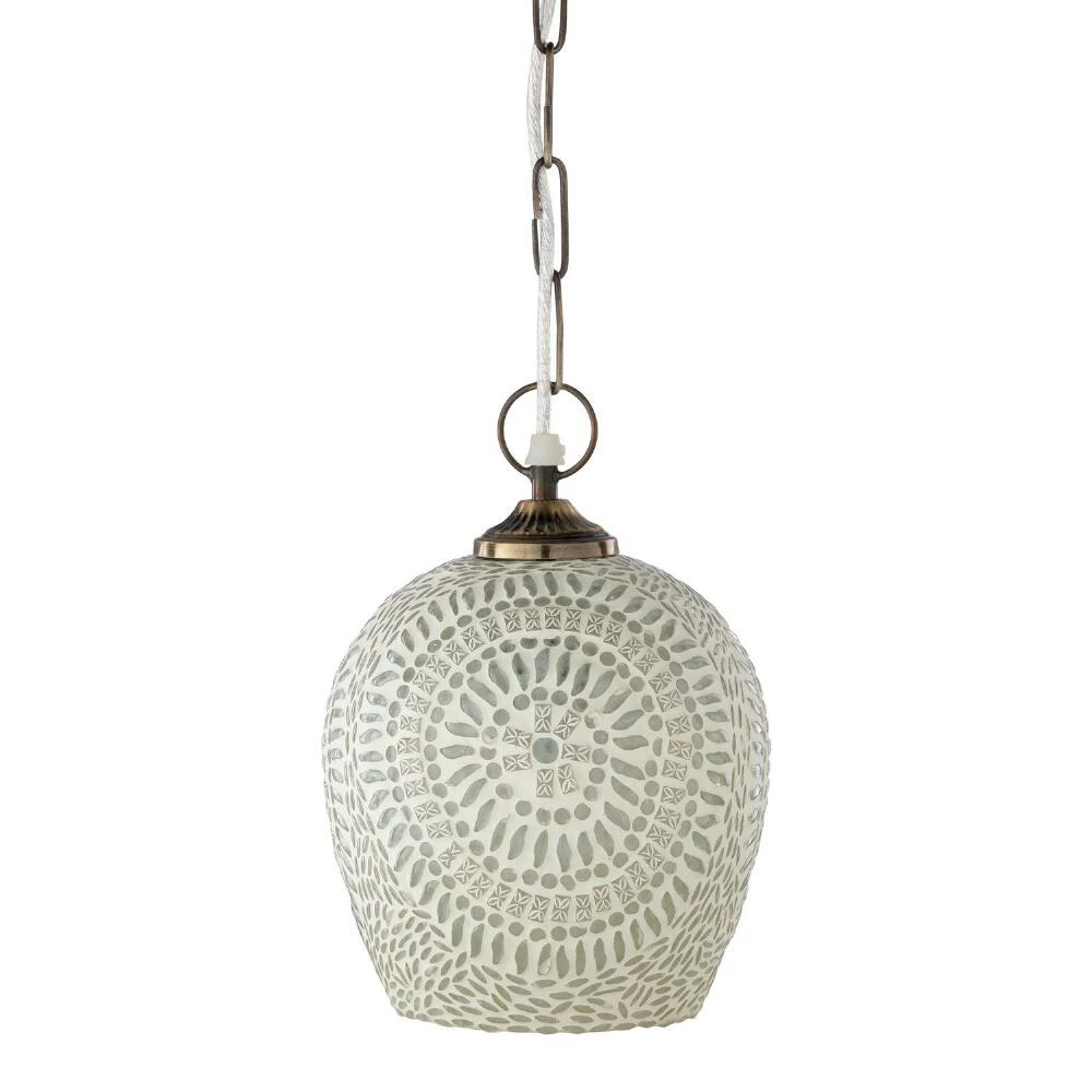 The Daleyza pendant lamp from Surya features a bell-shaped shade of white glass embellished with a hand-finished geometric design. Both elegant and eclectic, these intricate etched patterns add global inspiration to any room and complement traditional, modern or boho decor. Hanging from a brass chain, this pendant shines beautifully in small spaces and is easy to coordinate in multiples to illuminate the kitchen or dining room.