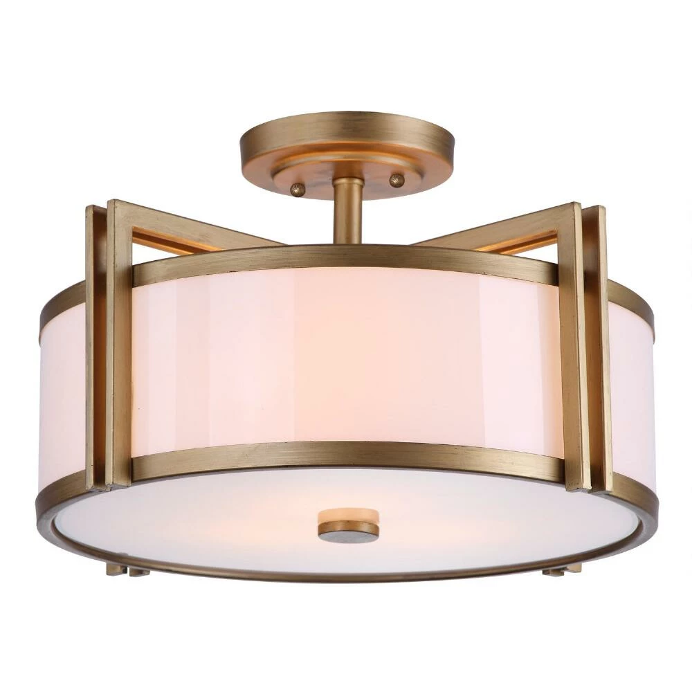 Taking after the Arts & Crafts movement with a modern edge, this substantial three-bulb flush-mount ceiling light showcases a cream-colored drum shade. We adore how the antique gold finish on the angular frame and hardware infuses any entryway, dining room or kitchen with luxurious shine.