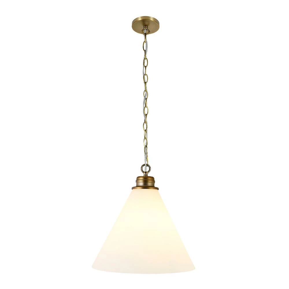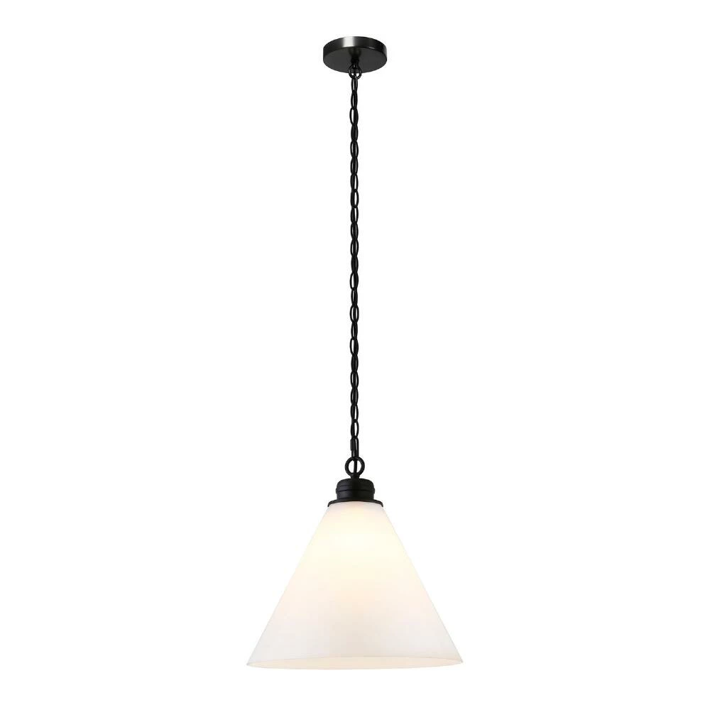 With an oversized white glass cone shade and adjustable metal chain, this pendant lamp illuminates a kitchen, foyer or living space with an ambient glow. Available in blackened bronze and brass finishes, this sophisticated lighting solution is fit for traditional and contemporary spaces alike.