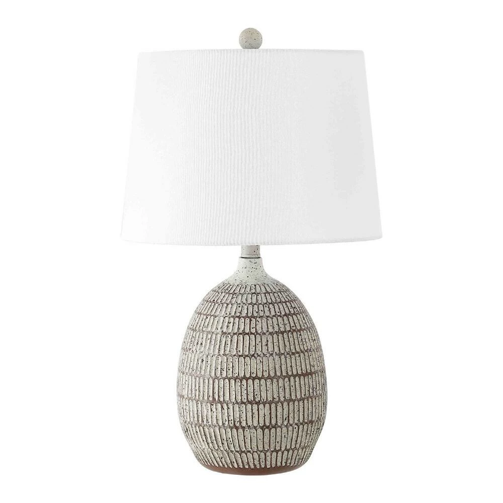 White textured carved accents give the brown Dewlen table lamp its dimension and architectural appeal. Topped with a white, light-filtering cotton shade, this contemporary lamp is a sophisticated addition to any end table.