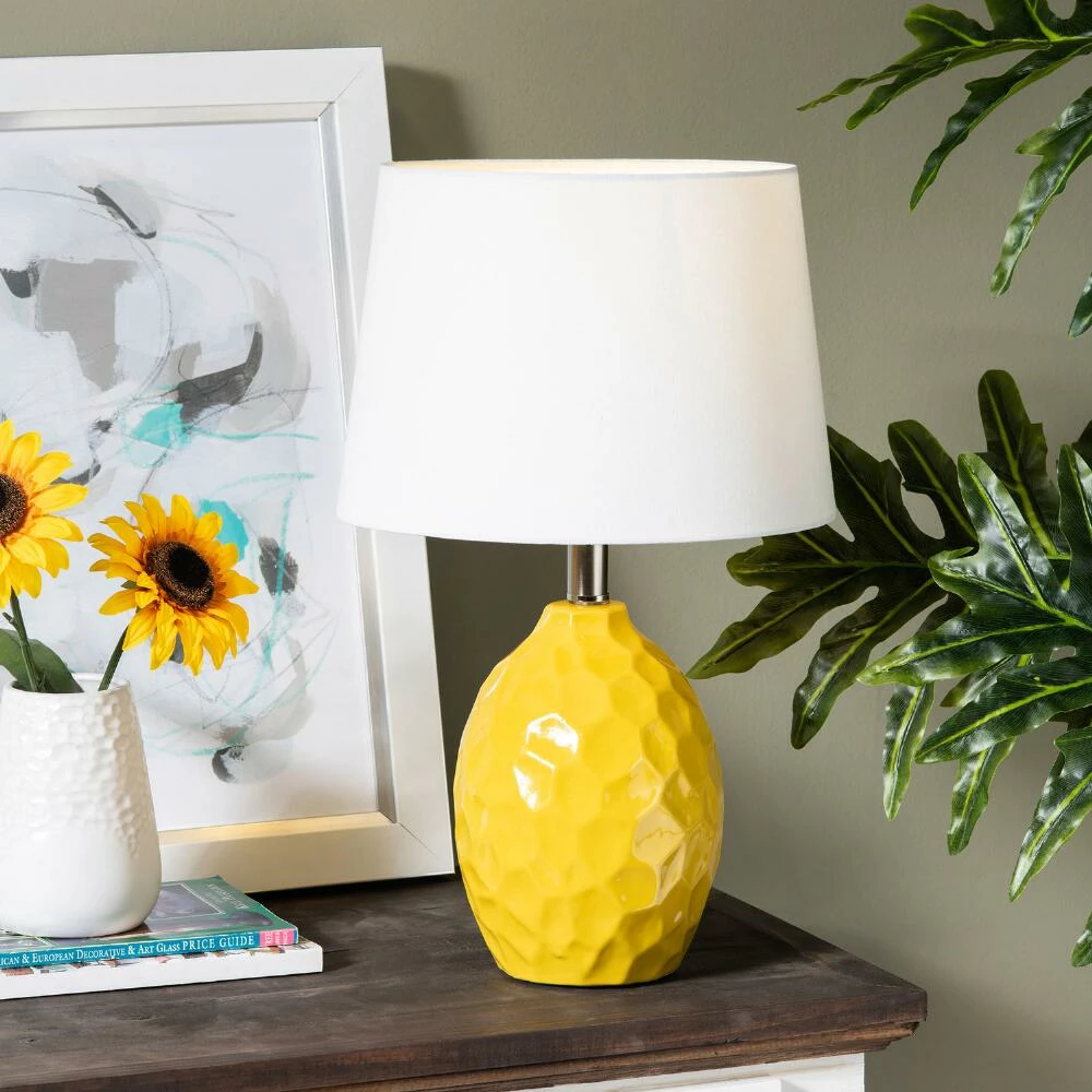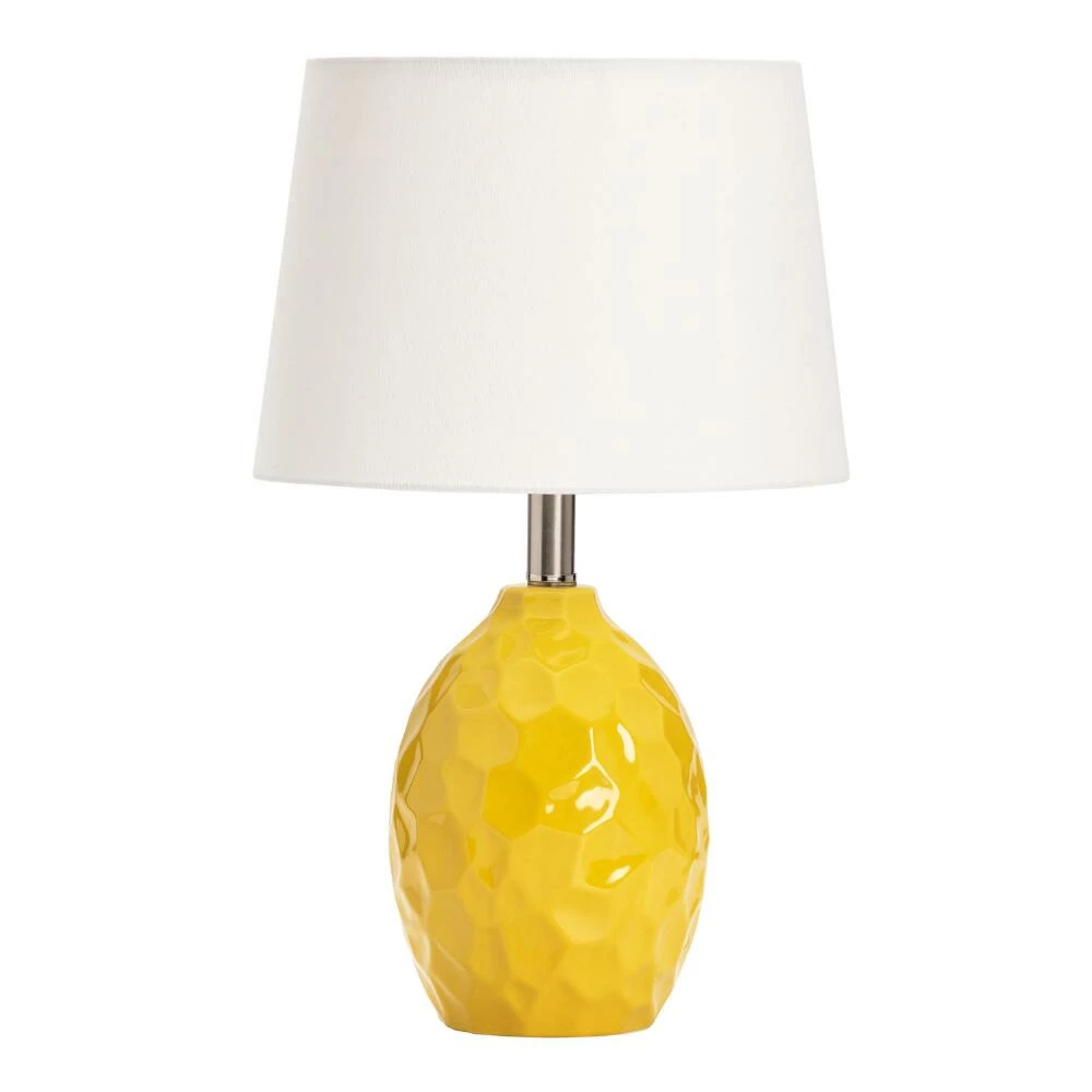 Crafted of ceramic with a silver neck and crisp white-linen drum shade, the Dix table lamp features geometric facets in its glossy rounded base that shine in the light. A colorful accent with an eye-catching texture, it adds new dimension to the living room, bedroom or office in a bright yellow hue.