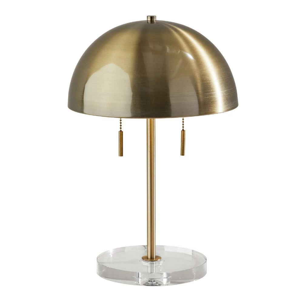 Set on a round clear glass base, the Dome table lamp features a sleek antique-brass body and dome shade. With curves that hint at an art deco aesthetic, this vintage-inspired task lamp has an easily accessible shade switch, making it a convenient addition to a nightstand, end table or desk.