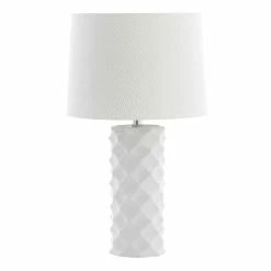 The geometric texture of our table lamp lends a sculptural element to its modern appeal. With a white ceramic body and fabric shade, it’s a sophisticated addition to your living decor.