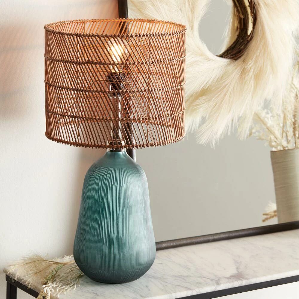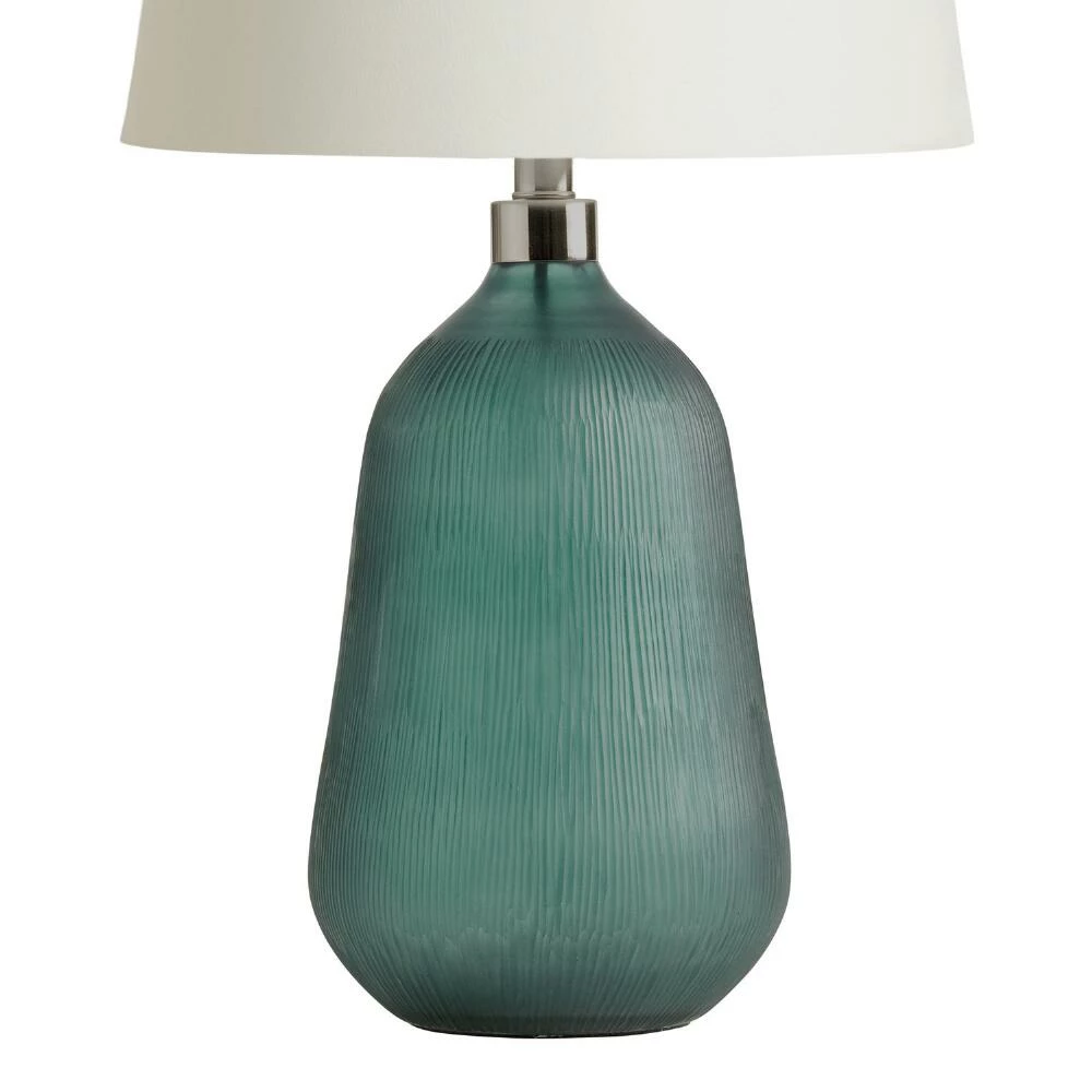 To create our exclusive lamp base, artisans mold glass into an organic gourd shape and carve it with textural details. Finished in frosted teal, this shapely contemporary accent brings handmade beauty to your decor. Complete the look with the World Market table-lamp shade of your choice.