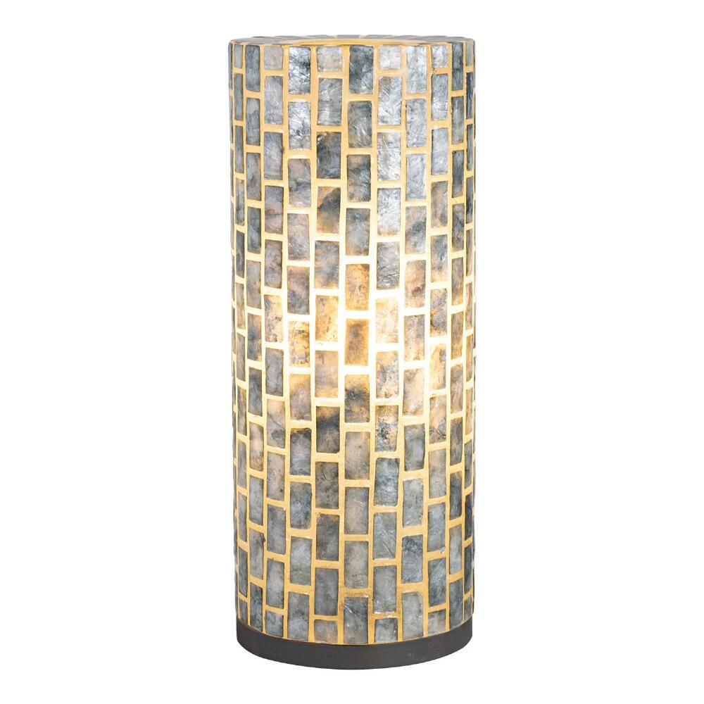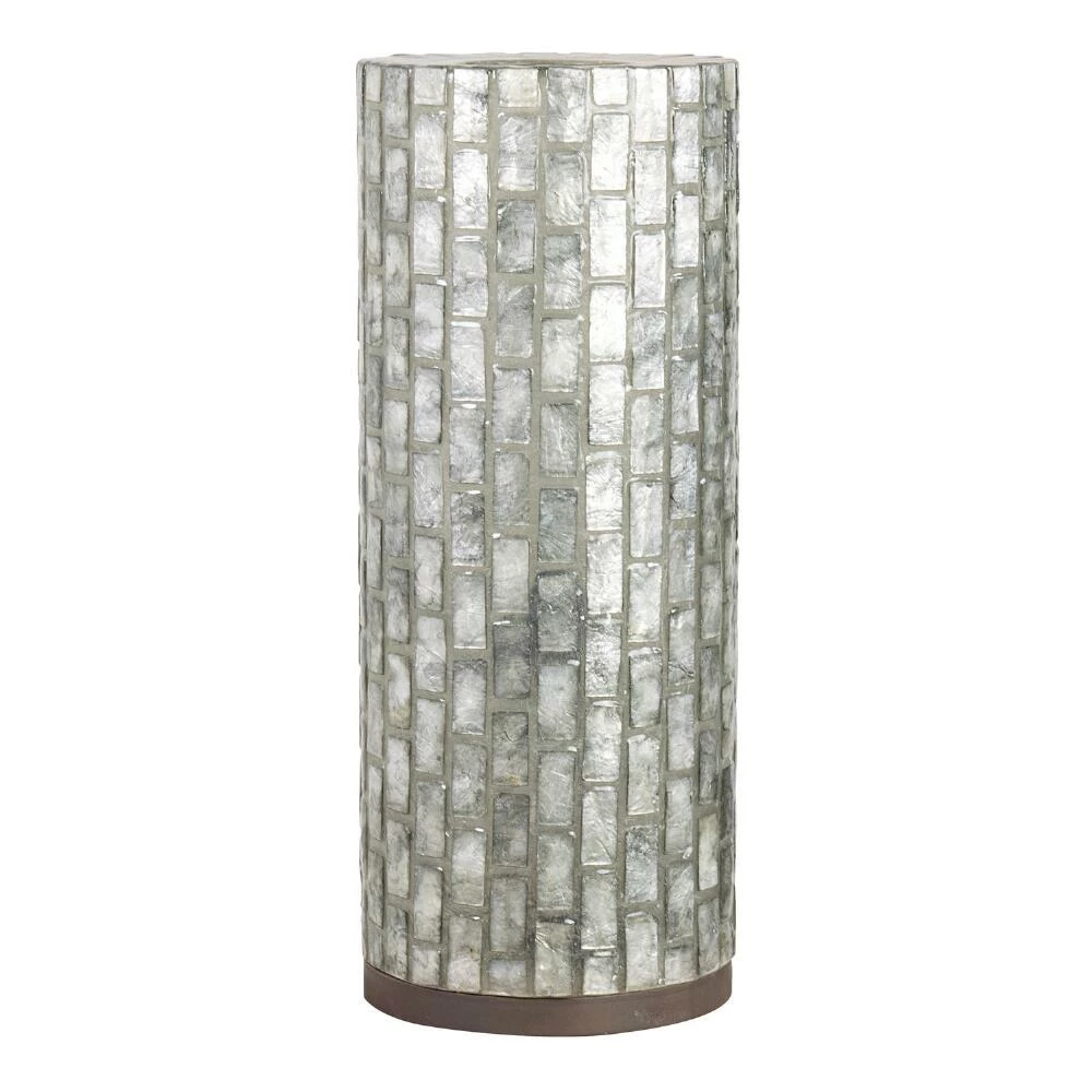 Featuring a large cylindrical fiberglass frame adorned with capiz shells by Indonesian artisans, this stunning accent lamp stands tall on its slim natural mango wood base. This vertical table lamp adds a warm and inviting natural appeal to any setting.