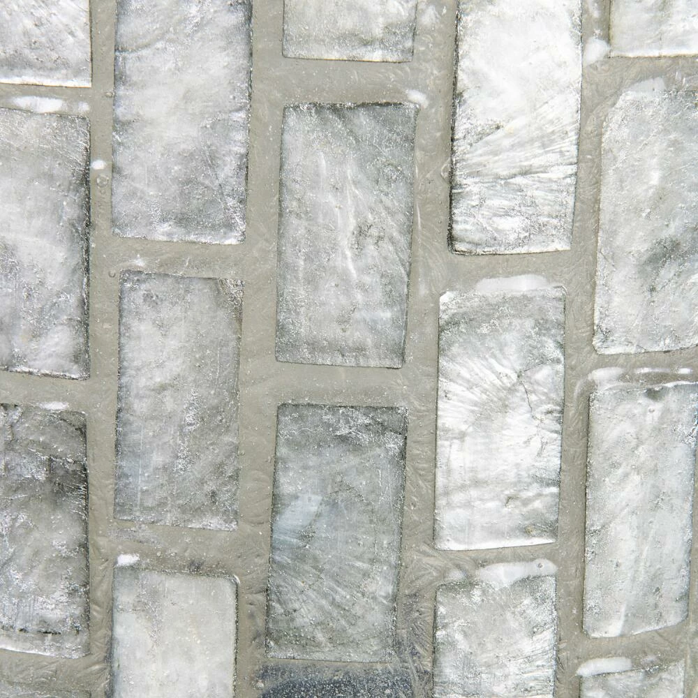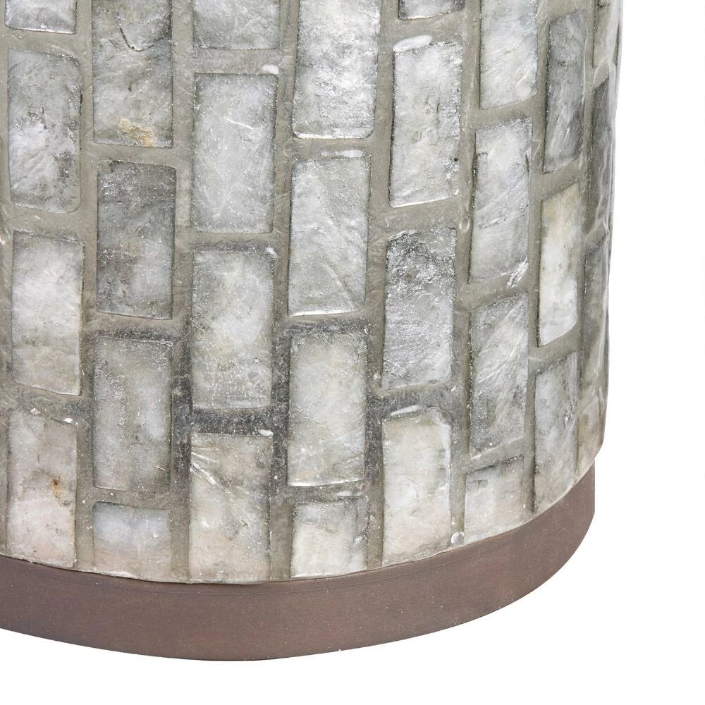 - Crafted of capiz shells and fiberglass with gray finish and mango wood base