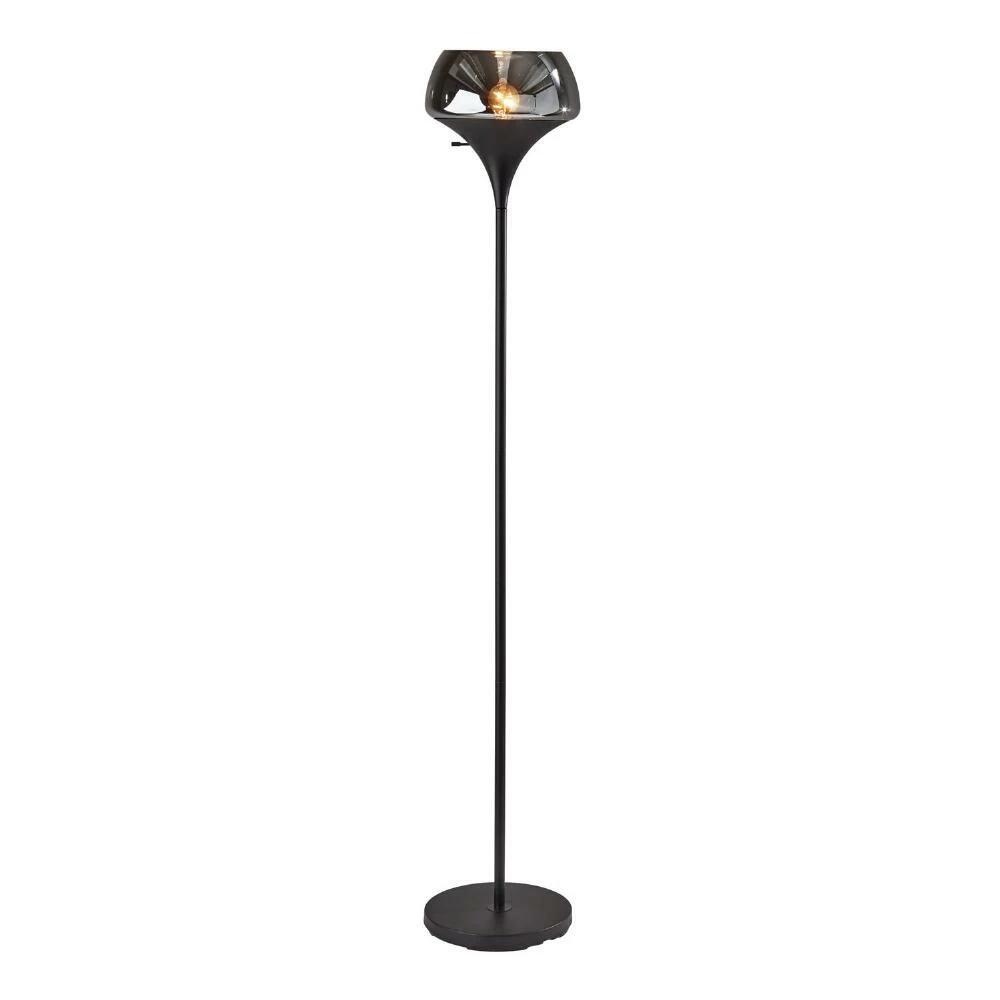 The Eliza torchiere floor lamp makes a contemporary statement with its slender black metal body and upturned, architectural smoked glass shade. An ambience-enhancing addition to the living room or bedroom, this sleek standing lamp features a 3-way rotary switch that lets you control the brightness of its warm light.