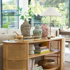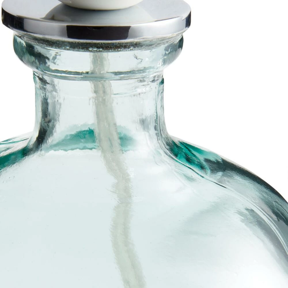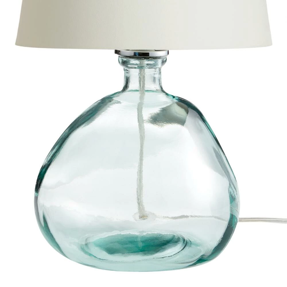 The Emilia table lamp features a shapely body handcrafted of recycled glass with a distinctive green tint and a white fabric drum shade. A classic, versatile addition to any decor theme, this accent light is beautiful placed on a nightstand in the bedroom or side table in the living room.