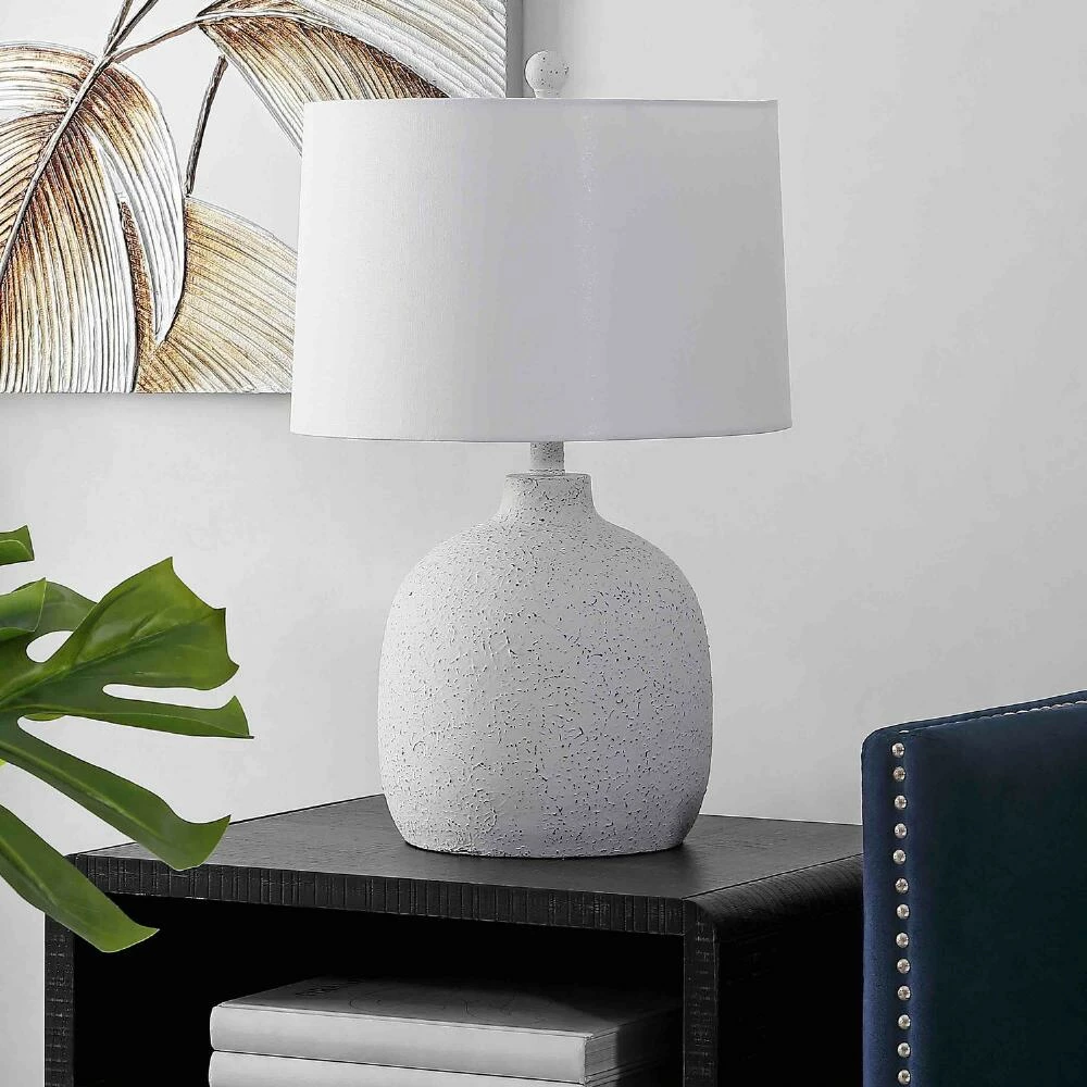 Bring artful illumination to your space with the Eveleri table lamp from Safavieh. Featuring a shapely body in a white speckled finish, this textural boho accent lamp is topped with a tapered shade that filters light and creates a warm glow.