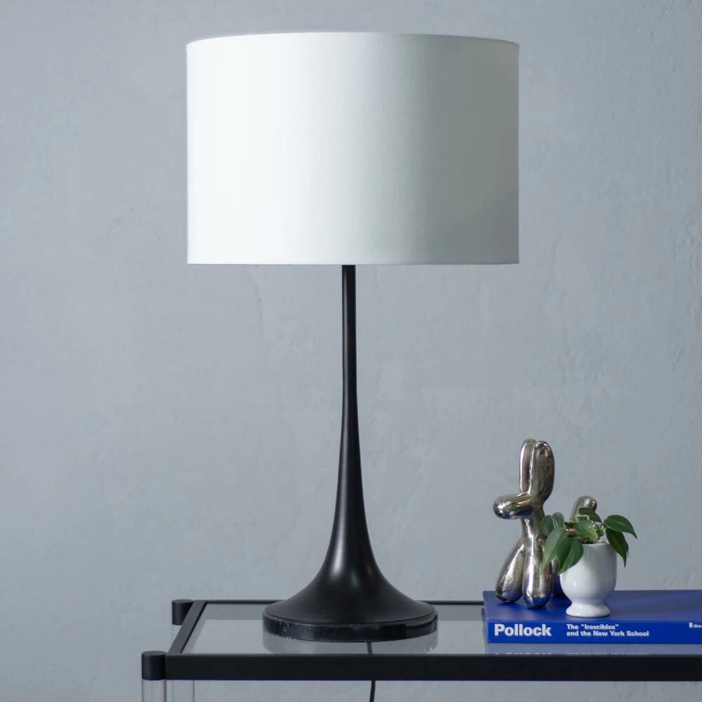 With classic good looks and a strong silhouette, this handsome table lamp is appealing anywhere. It’s anchored with a black marble tulip-shaped base, fitted with a black fabric cord and topped with an off-white cotton drum shade for a soft glow and timeless style.