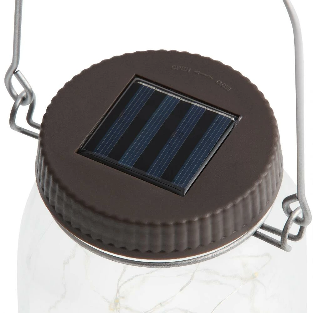 - Crafted of glass, wire with brushed silver finish, firefly micro-LED lights and rechargeable solar-panel lid