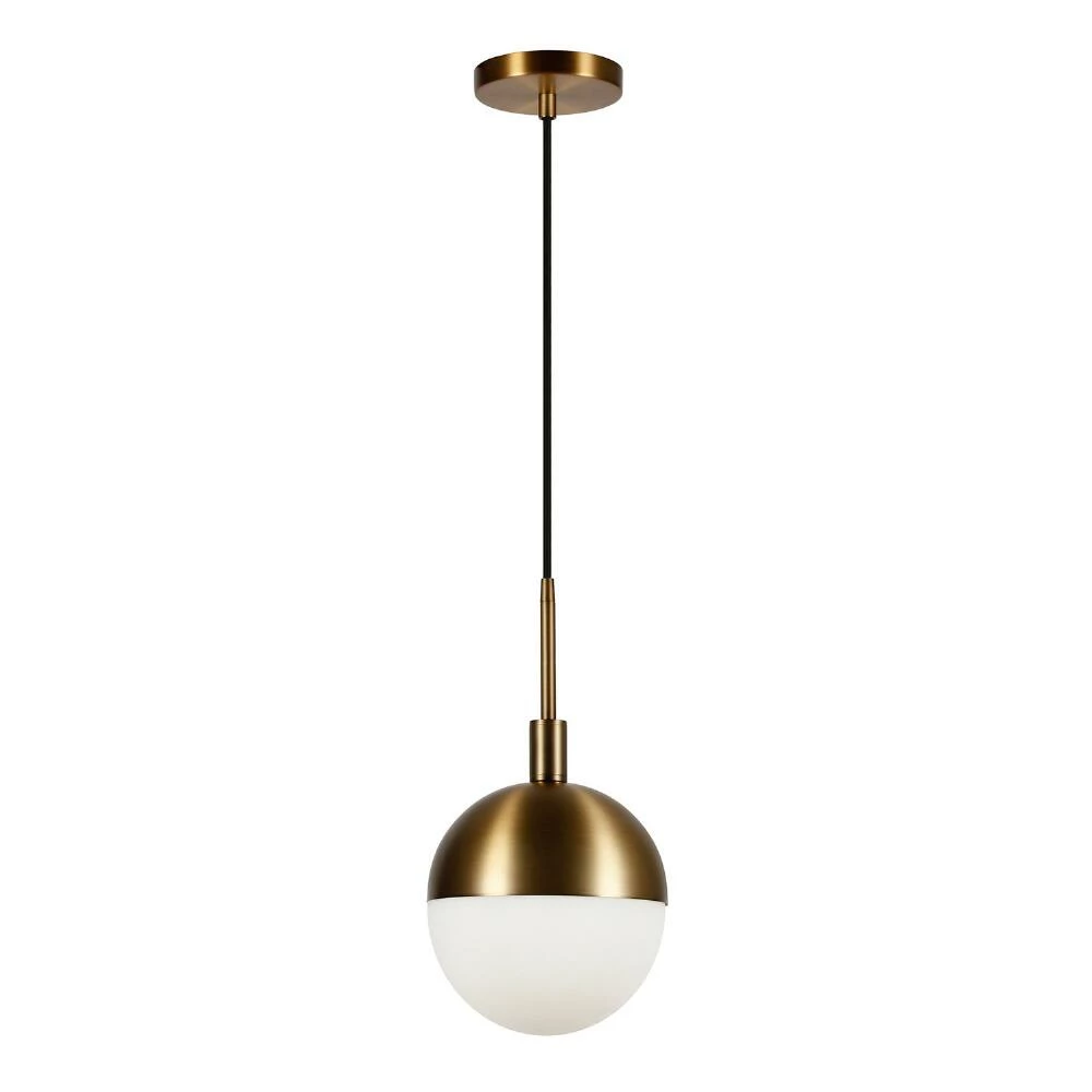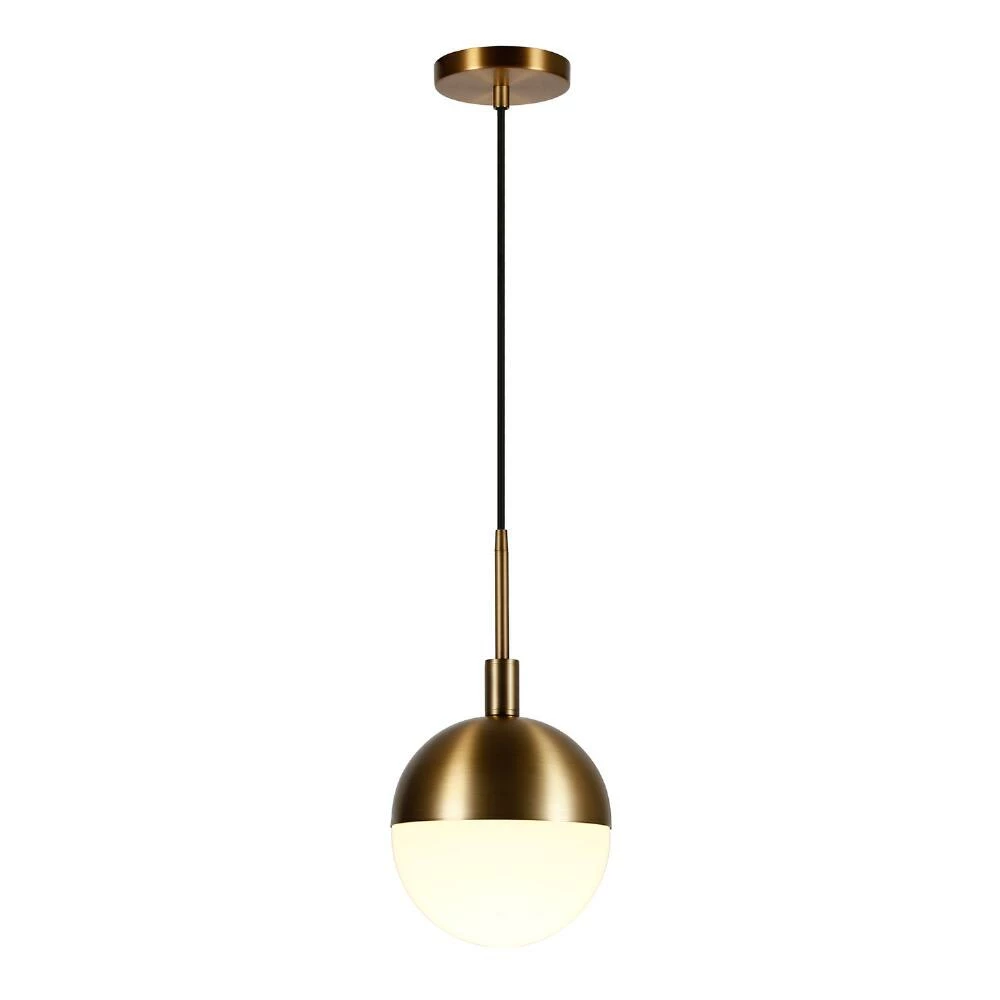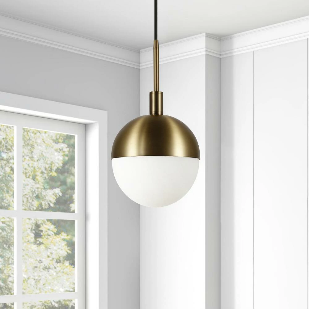 Taking inspiration from mid-century design, this cozy modern pendant lamp illuminates your space with an orb-shaped shade crafted of frosted glass and warm golden brass. Available in two sizes that coordinate together beautifully in pairs and multiples, its blend of gleaming brass and vintage-style white glass adds new inspiration to the kitchen, dining room or an entry.