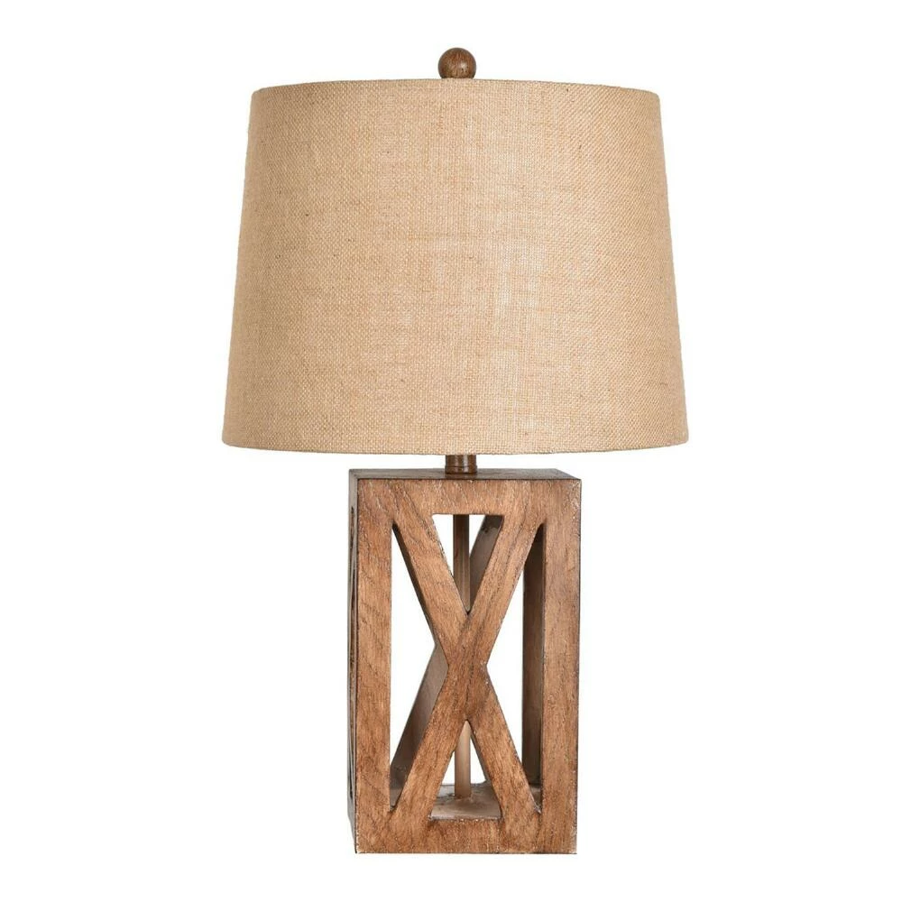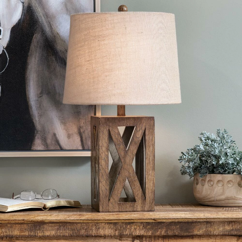 Featuring a rectangular base with an open X-crossed design, the Galena table lamp is crafted of realistic faux wood in warm brown. Pairing an industrial-style silhouette with a rustic finish and a textured burlap drum shade, this versatile lamp blends with modern, farmhouse and lodge-style decor.