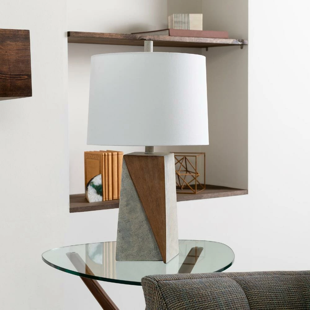 The Gaspar table lamp from Surya is sculptural modern art that features a two-tone concrete base hand finished in mottled gray and warm brown. With a square base, the block-shaped silhouette is divided into geometric triangles to showcase its realistic blend of marble-like and woodgrain-inspired colors. This architectural desk lamp is perfectly contrasted with a round drum shade in white linen.