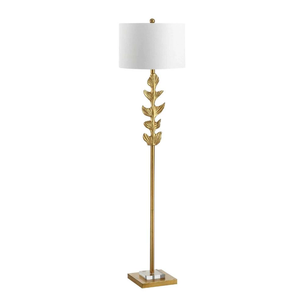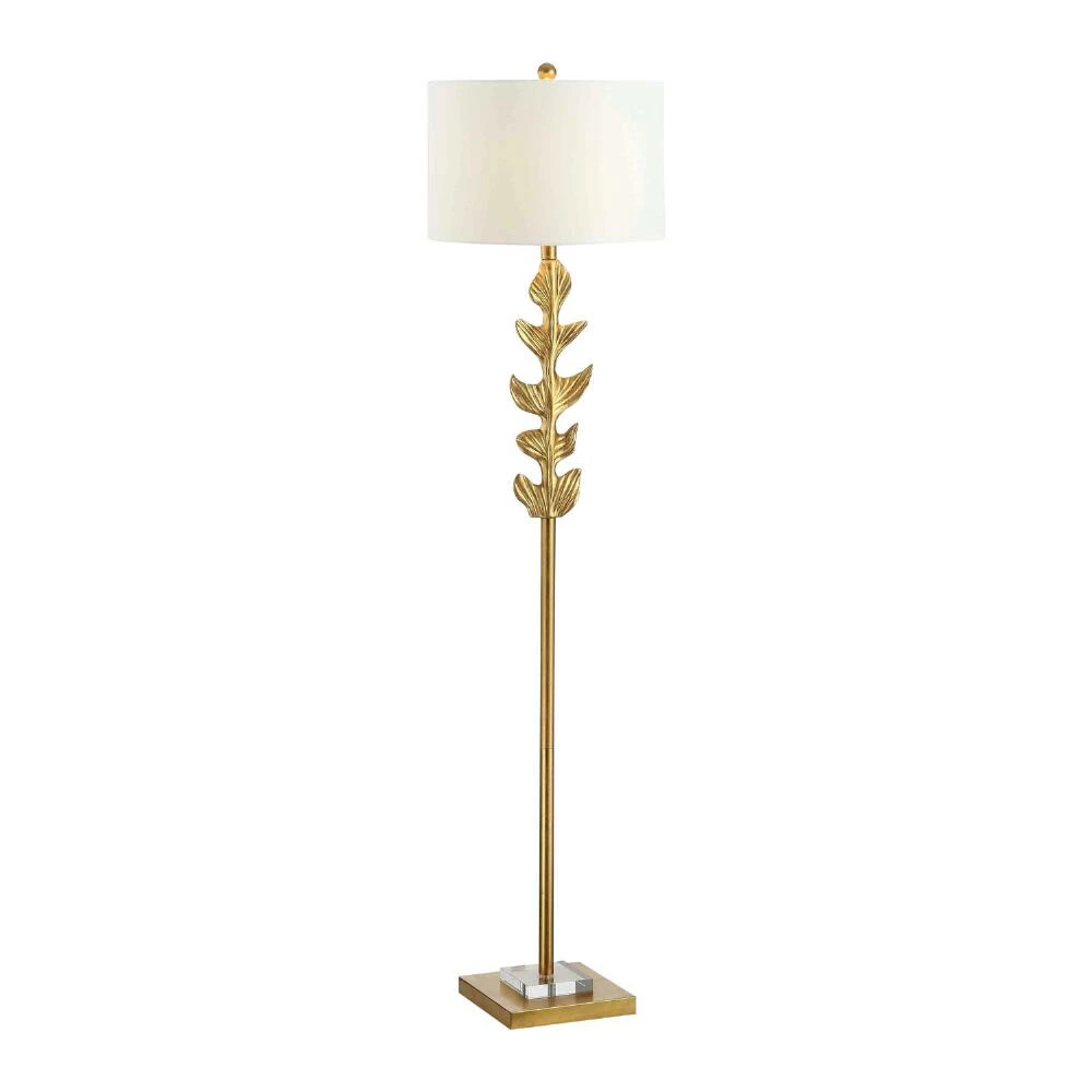Bring botanical beauty to your interior with the Georgiana floor lamp from Safavieh. Detailed with textured leaves, this regal floor light exudes luxury with its luminous gold finish and crystal base accent. A white cotton drum shade completes the look of this light source and gently diffuses light into a warm glow.