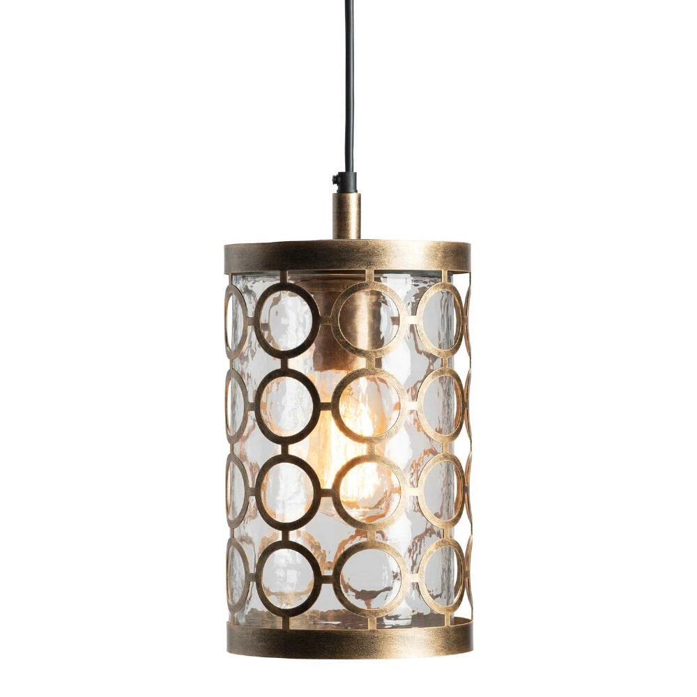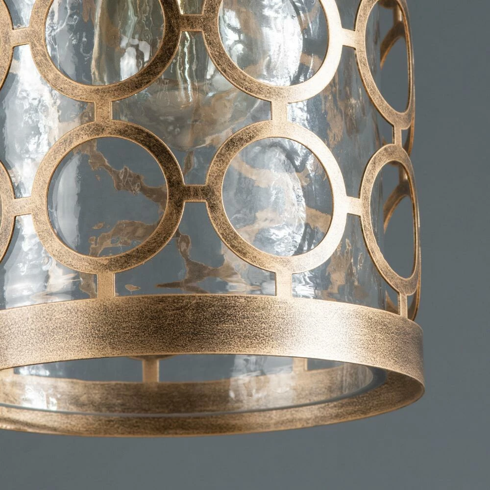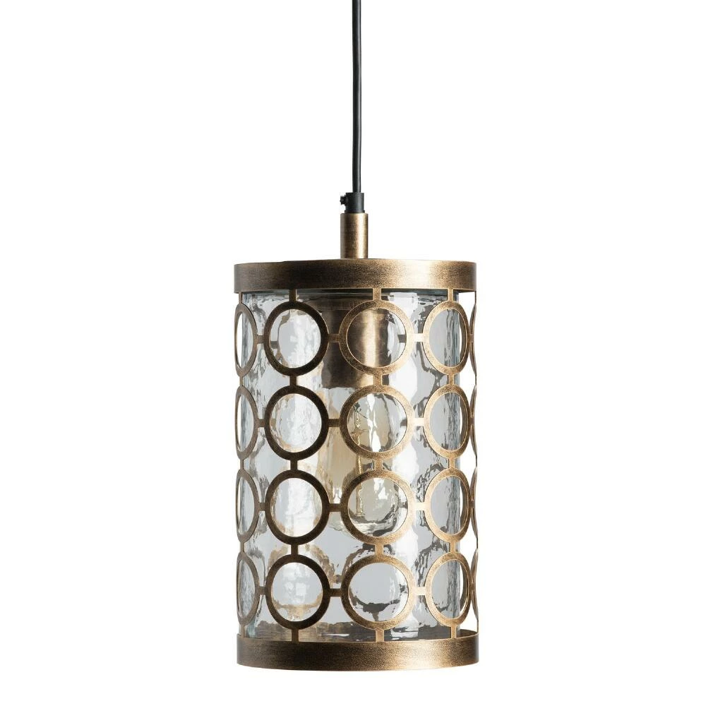 Crafted of clear glass with a Moroccan-inspired geometric design in distressed antique brass, this cylindrical pendant lamp adds well-traveled traditional style to the dining room or kitchen. Its vintage-inspired pattern of connected circles creates a beautiful interplay of light and shadow as light pours through the glass, an effect that’s amplified when coordinated in pairs and multiples.