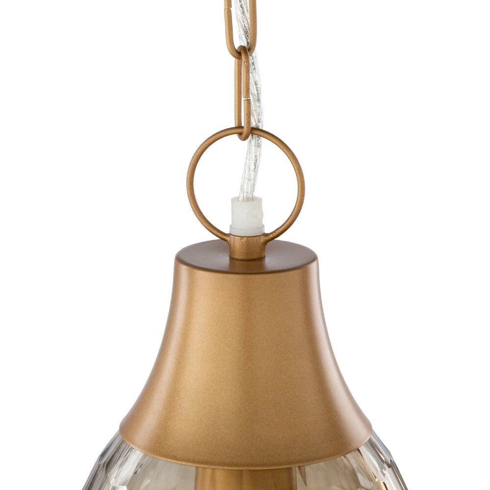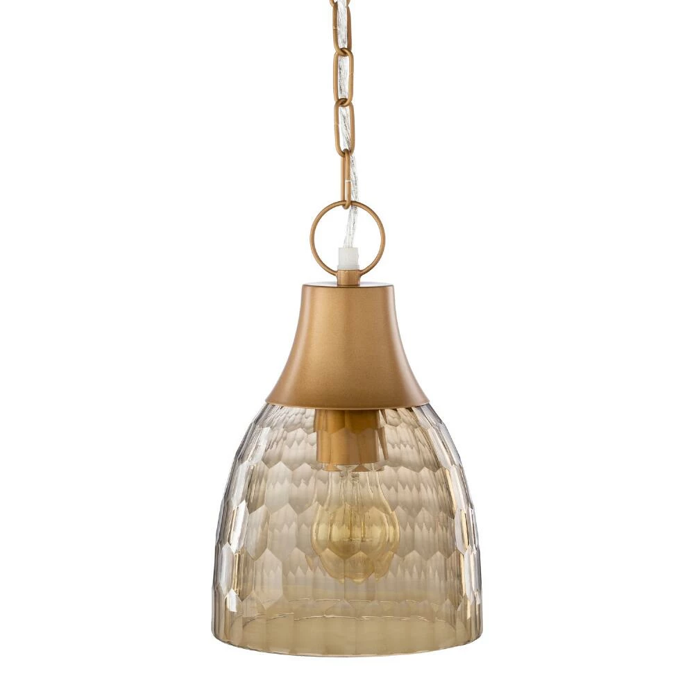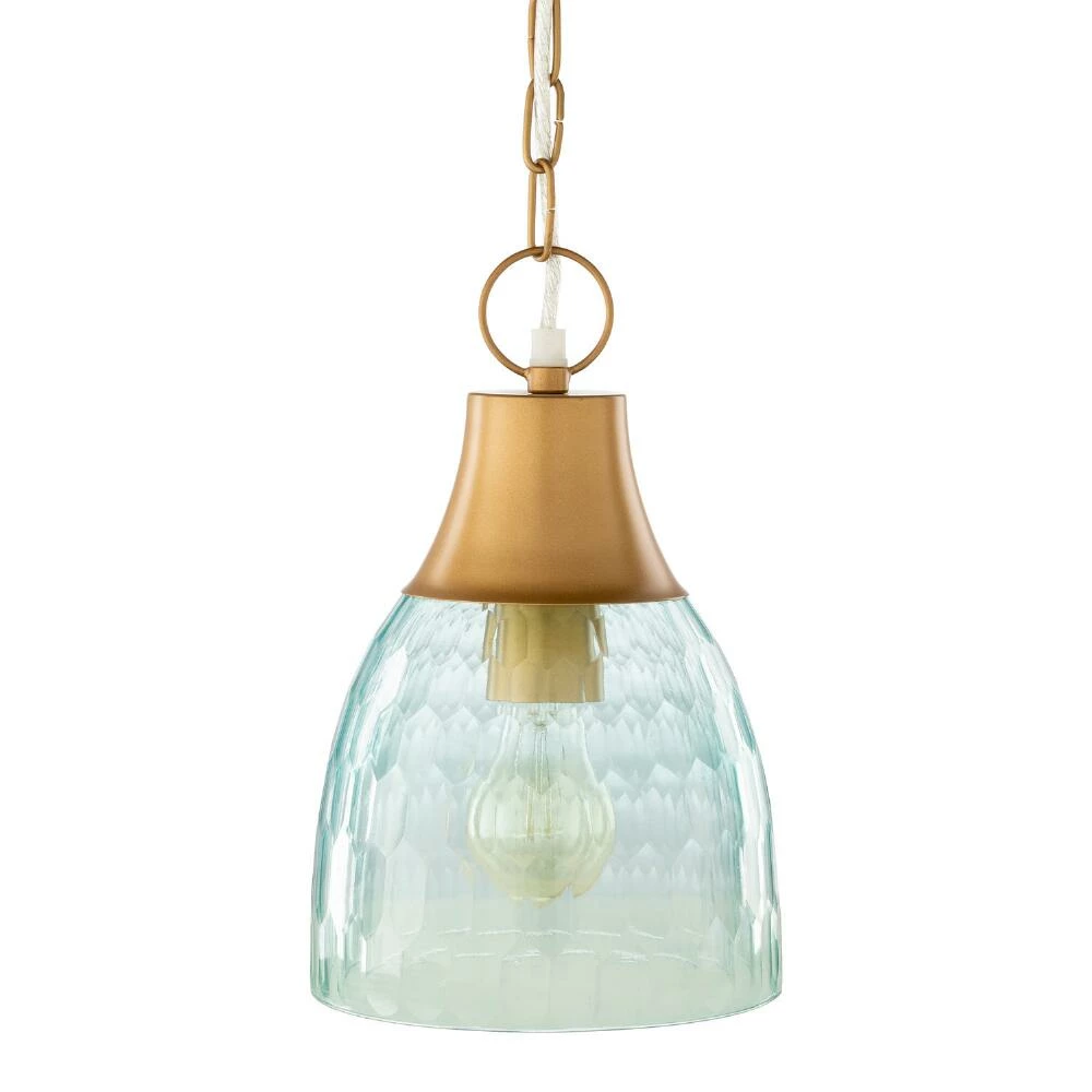 Refracting light through wheel-carved glass in aqua or bronze hues, the Glasshouse pendant from Surya features a dome-shaped shade and a hand-finished brass fixture, holder and chain. Its open base directs light downwards into the kitchen, dining room or hallway as it illuminates the textured hexagons carved into its tinted glass shade. A standout hanging lamp for small spaces, its modern geometric symmetry is enhanced in coordinated multiples.