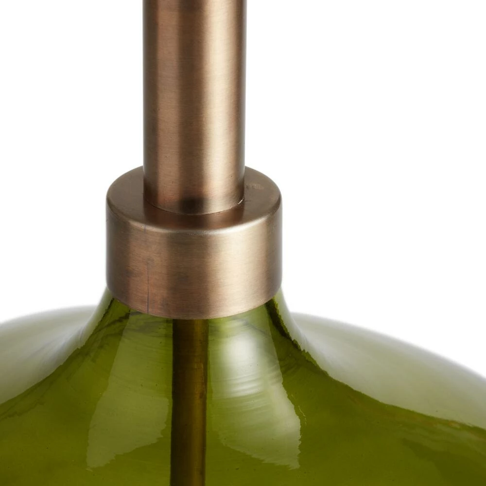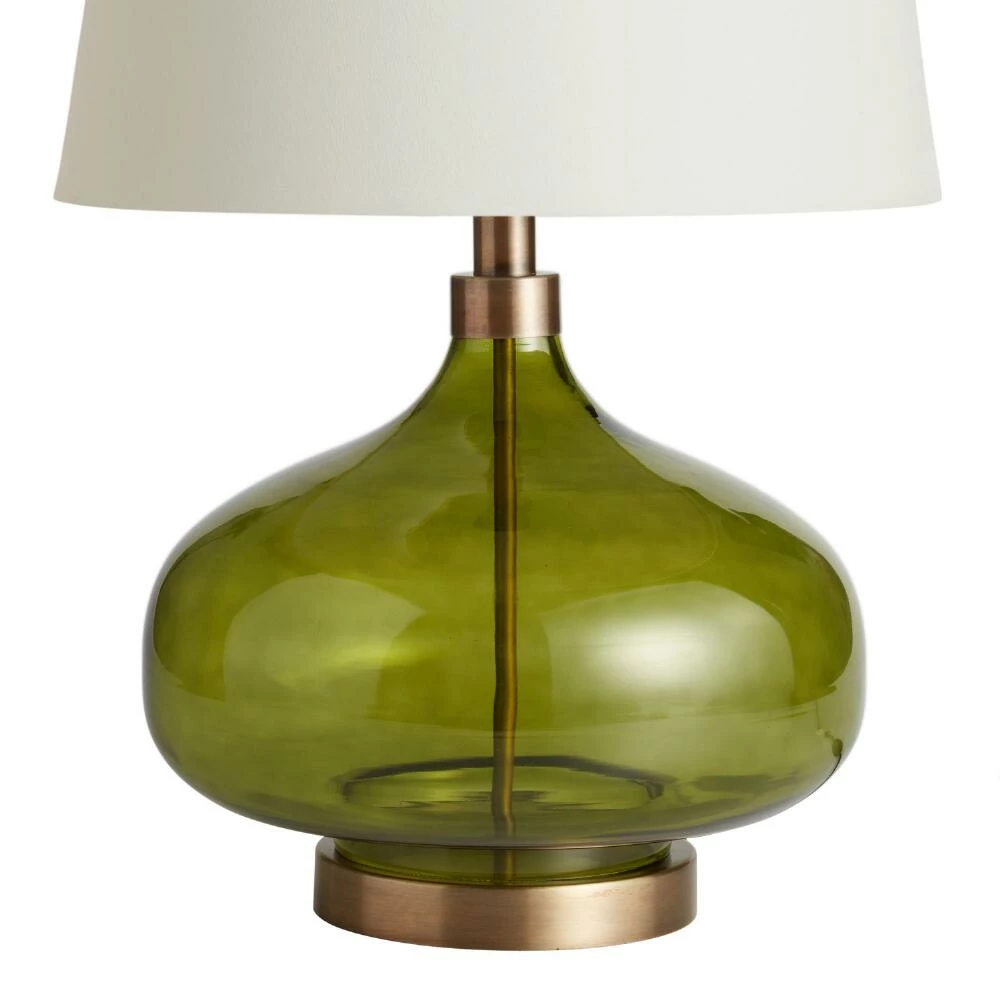 Mouth blown by expert glassworkers, our Halsey table lamp base exemplifies mid-century design with its smooth teardrop shape in a translucent green hue. Luxe antique-brass accents perfectly complement the organic shape and jade-like color of its glass body. Every lamp base is individually mouth blown, creating subtle variations in shape and size that make each piece a unique artisan achievement.