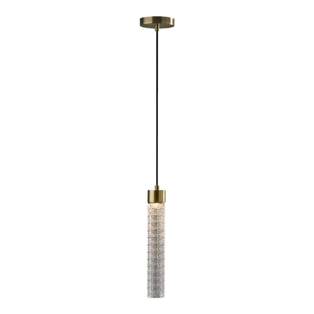 Bring luxe illumination to your space with the Harriet pendant light. Set on an antique brass canopy, this sleek, compact lamp delivers a wealth of mid-century glamour. With a cylindrical textured glass shade, this hanging LED light casts a warm, inviting glow that’s beautiful over the dining table or kitchen.