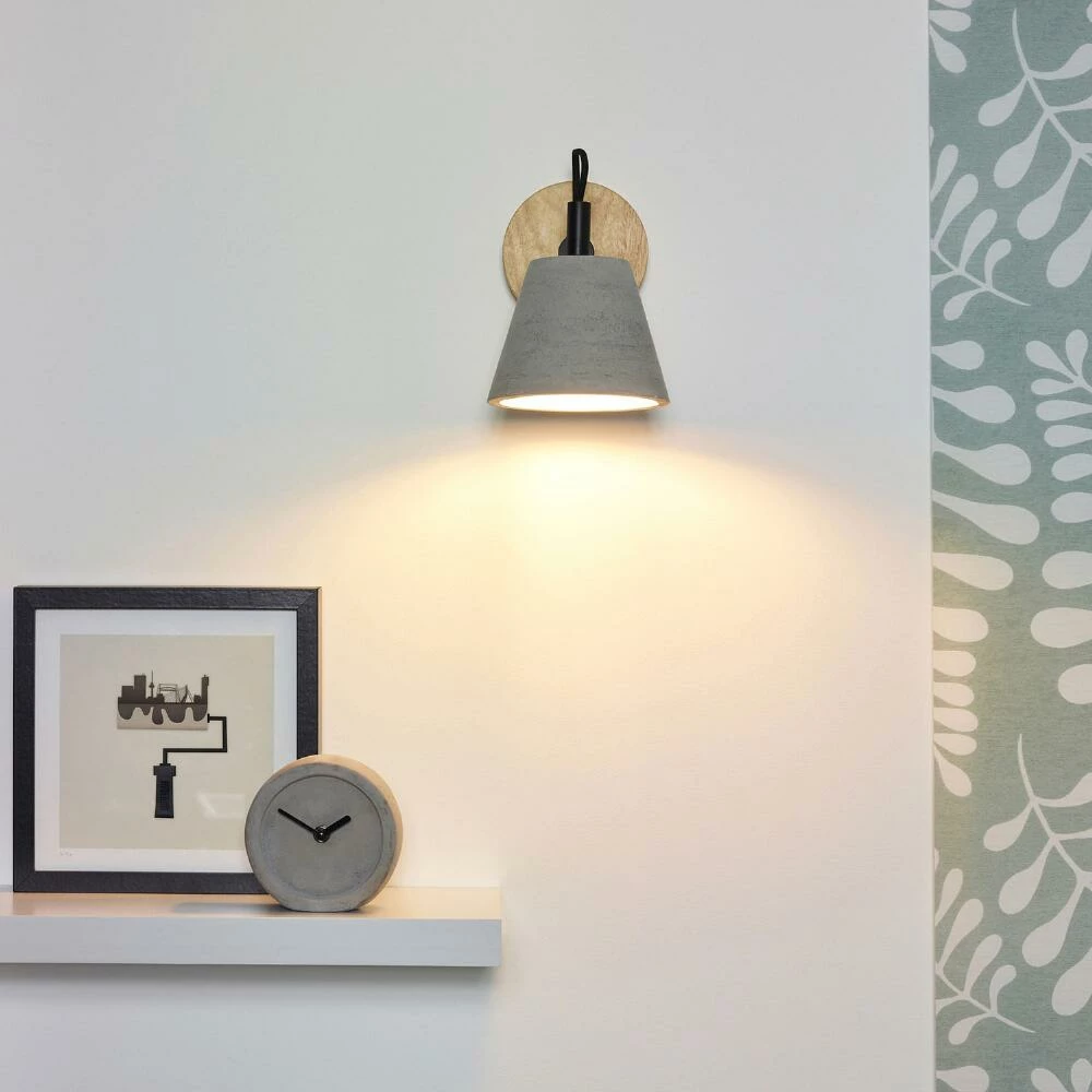 Bring a stylish aesthetic to your room with this traditional-looking Hayes wall sconce, made from modern materials for a stylish update. The rich-toned rubberwood wall mount and textured black steel arm contrast beautifully with the cool concrete lightshade for a contemporary lighting solution that’s perfect in a reading nook or over a nightstand.