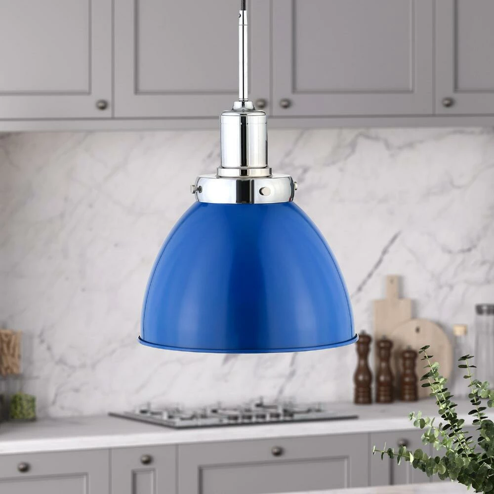 Add bright illumination and bold color to your dining room, breakfast nook or kitchen with the eye-catching Iris pendant lamp. This timeless-meets-modern light fixture is designed with a bright blue dome metal shade suspended by an adjustable woven cord and your choice of brass or nickel-finished hardware for an industrial touch.
