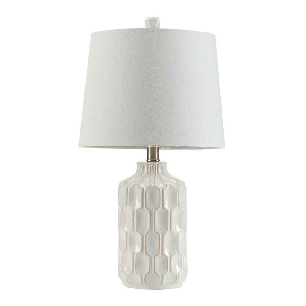 Contoured with a textural geometric pattern, this ceramic table lamp is a mid-century-inspired lighting solution with a wealth of dimension. Perfectly sized for an end table, desktop or nightstand, this accent light features a tapered white fabric shade that gently diffuses light and a textured ceramic finial to complete its boho look.