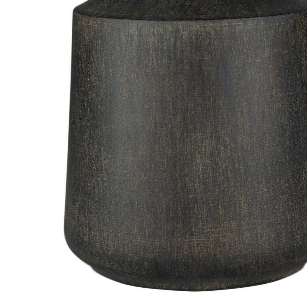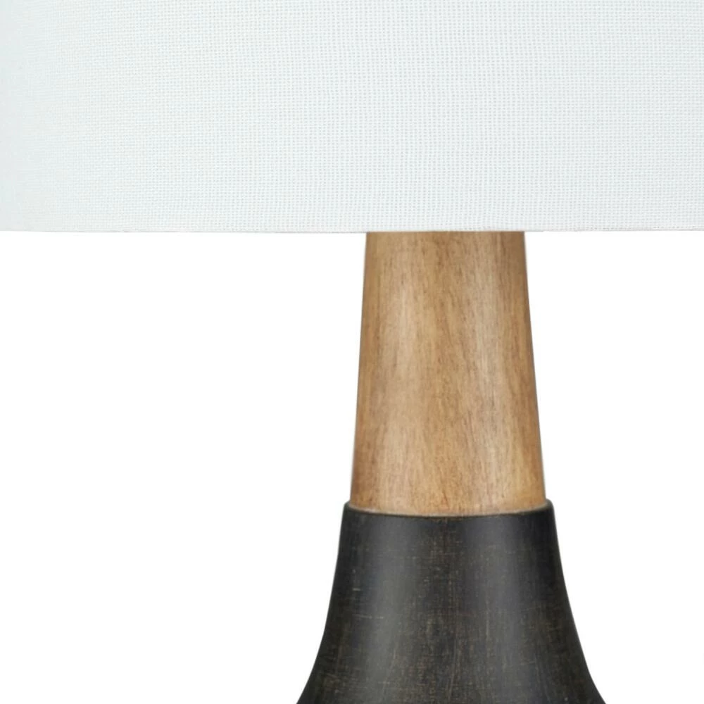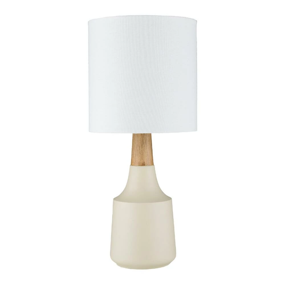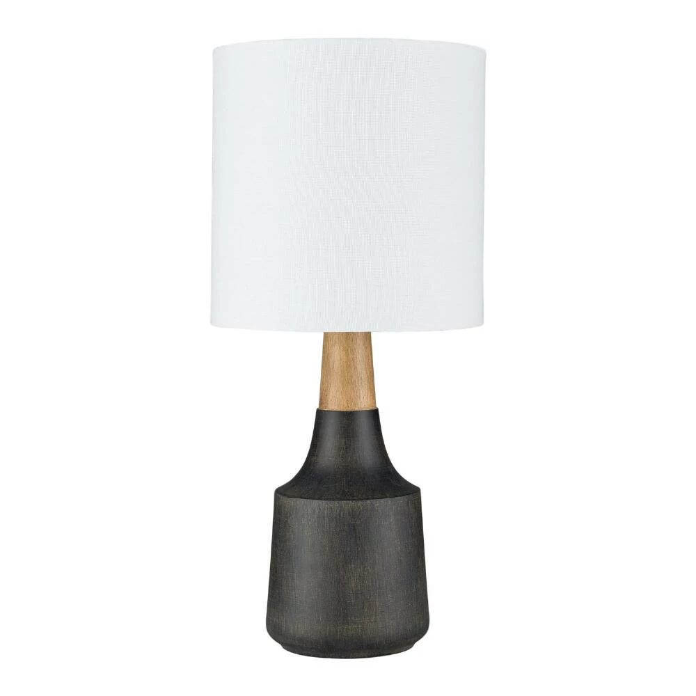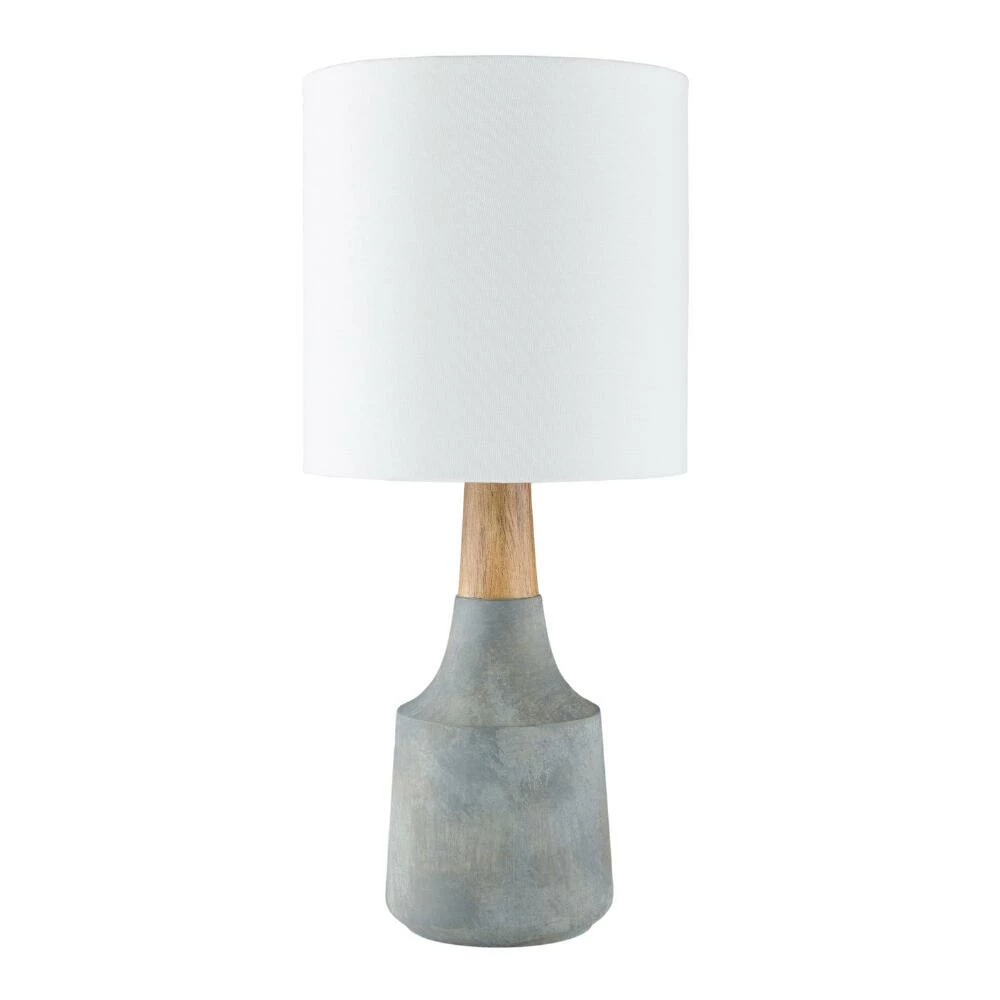 The modern Kent table lamp from Surya features a round base in ivory, black or gray with a faux-wood neck and crisp linen drum shade. Expertly hand-finished in a choice of neutral hues, its realistic woodgrain adds natural texture to its tapered silhouette and bright white shade. A sophisticated lamp in a petite size, it shines brightly on a nightstand, office desk or living room end table.