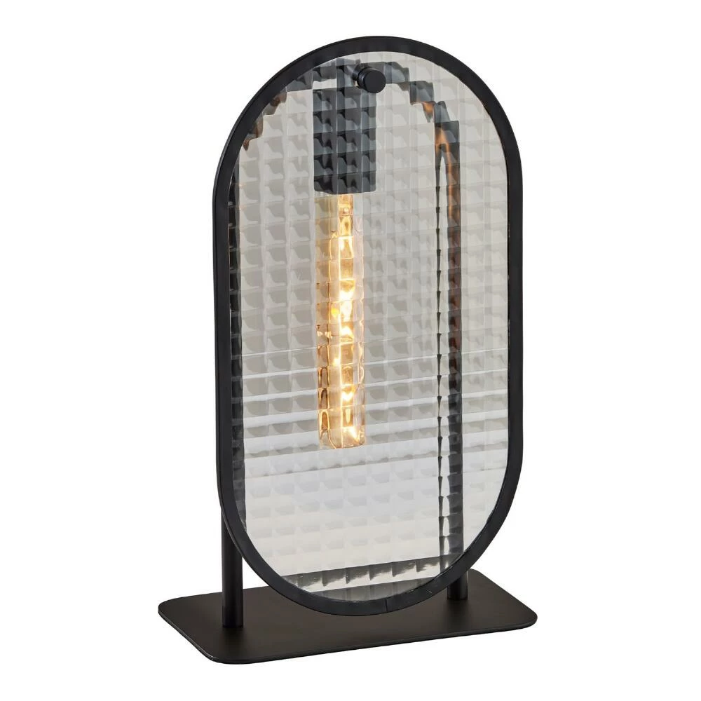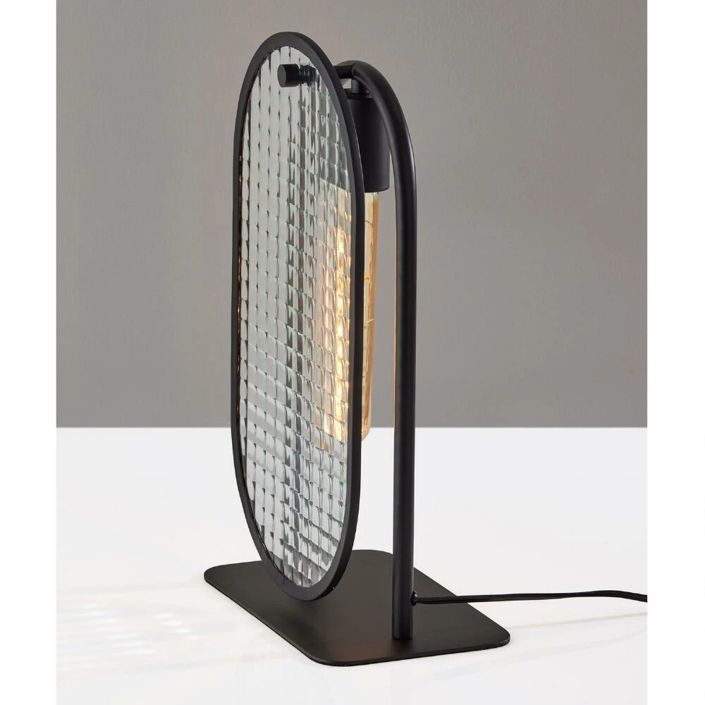 Brighten your interior with the striking Landon table lamp. This accent light features sleek black metal construction and two flat and oval textured glass shades that diffuse light with a hologram effect. A modern lighting solution for living room or bedroom, this desk lamp is a standout addition to nightstand or end table.
