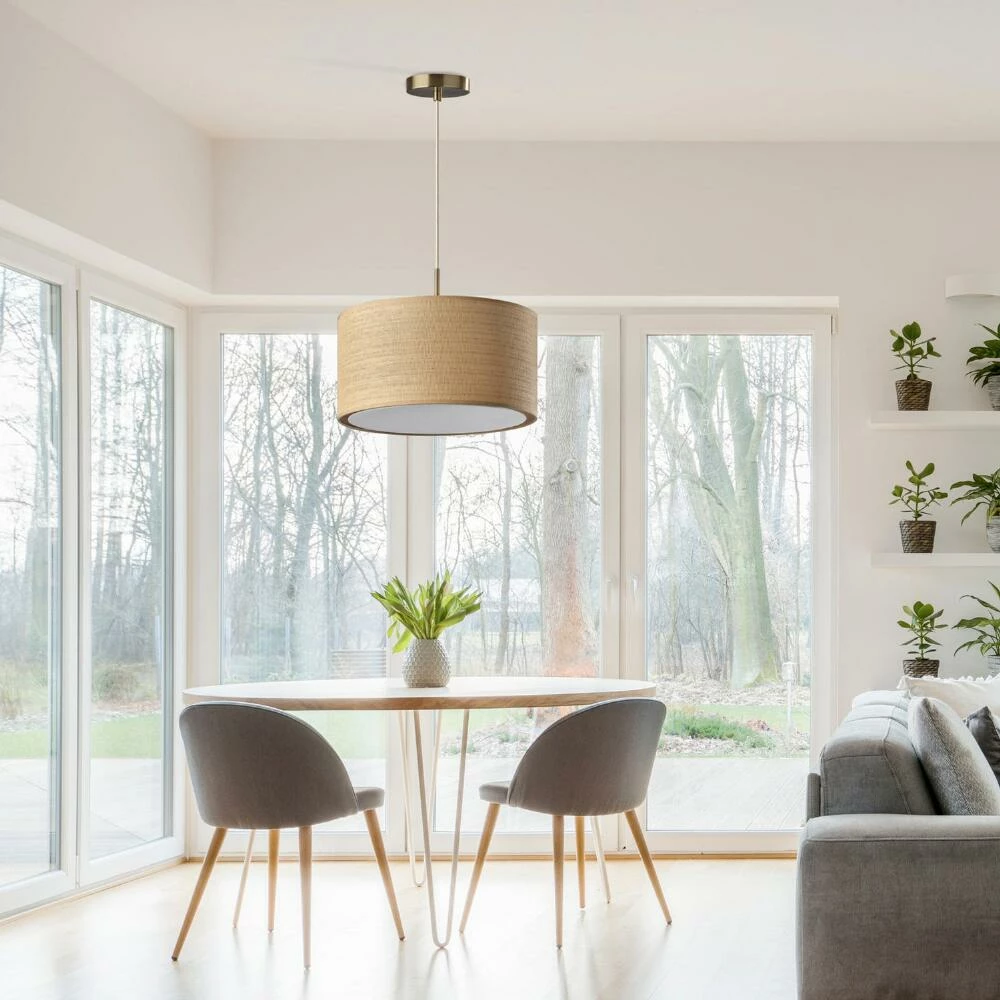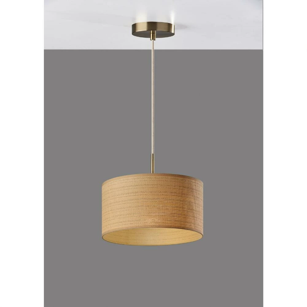 Pull off a coastal decor aesthetic with the Landor pendant lamp, suitable for hanging individually or in formation to brighten a kitchen table or island. Featuring a large drum shade woven from paper for a chic, natural-fiber effect that adds a warm glow to the light, it’s finished with a natural fabric trim to complement its chrome fixture and white fabric-covered cord. Available in two sizes, it adds a stylish lakehouse vibe to your space.