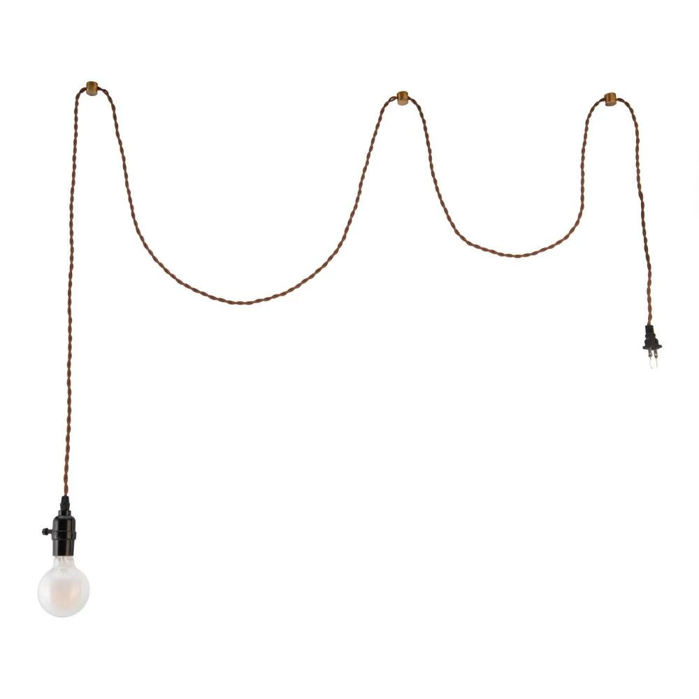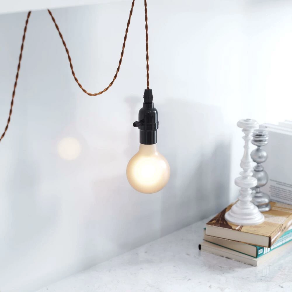 A small-space overhead lighting solution, the Leif pendant lamp plugs directly into an electrical outlet for hassle-free installation. This exposed-bulb pendant light features black hardware for a contemporary appeal with modern versatility. This pendant light comes with a stylish nylon cord over nine feet long and mounting anchors to hang it exactly where you need it.