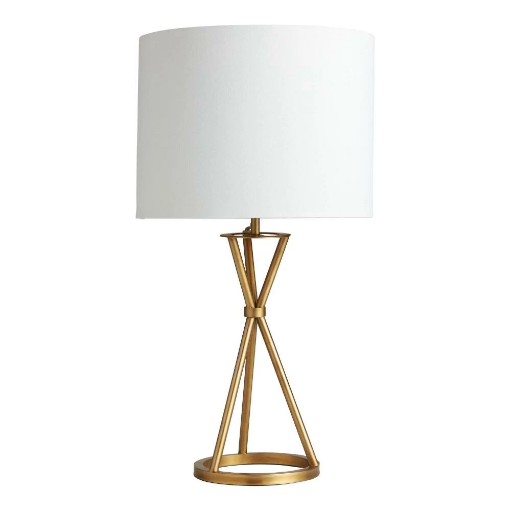 Our exclusive Leo table lamp is handcrafted with a circular tripod base in sleek antique gold with a dynamic X-crossed design. A space-saving addition to a modern living room, bedroom or study, this mid-century lighting solution lends warm ambience and sleek architectural appeal to any tabletop, nightstand or desk. Pair it with your favorite World Market table lamp shade to create the perfect complete look.