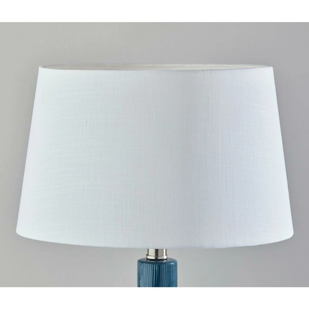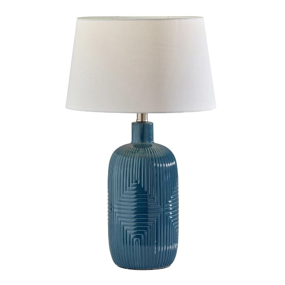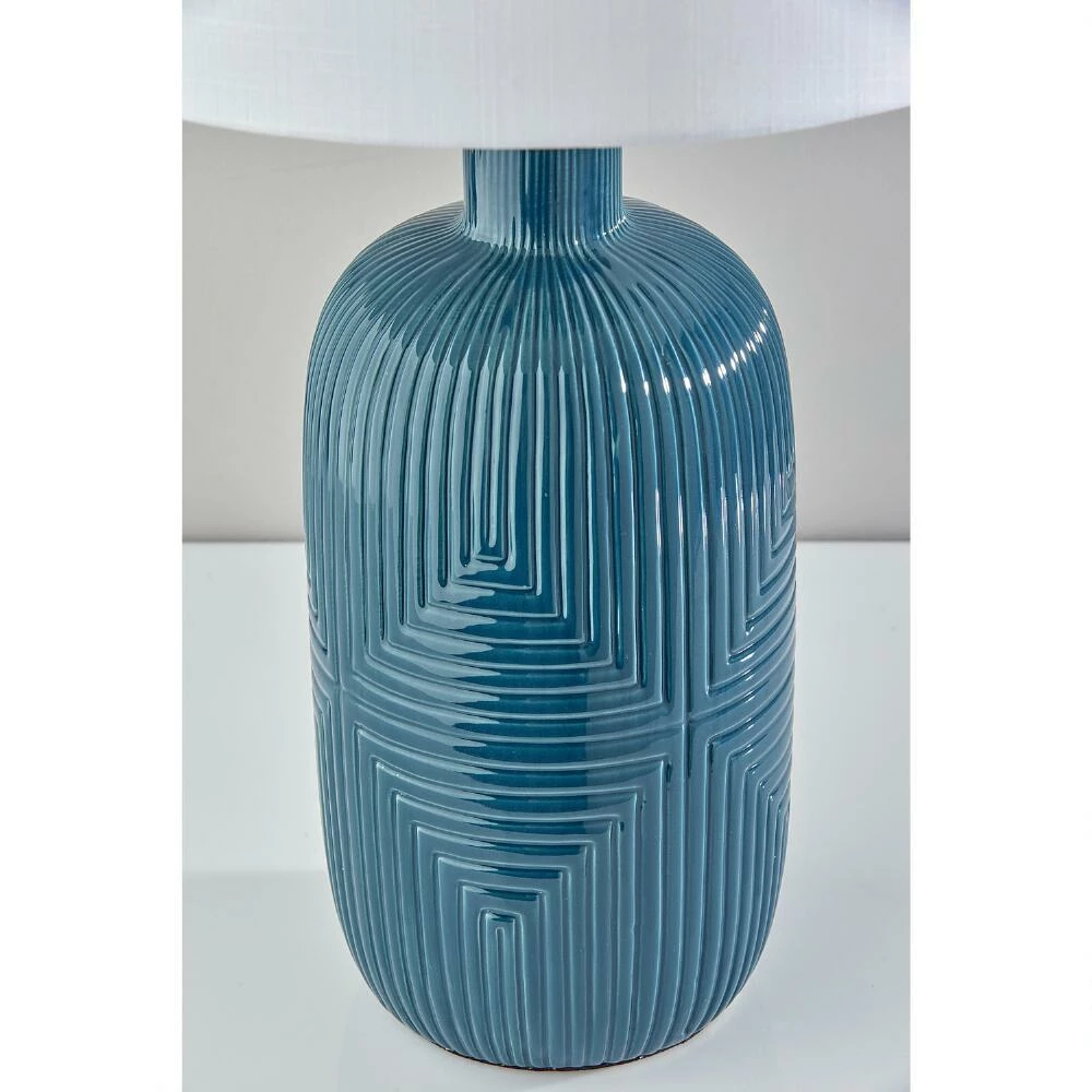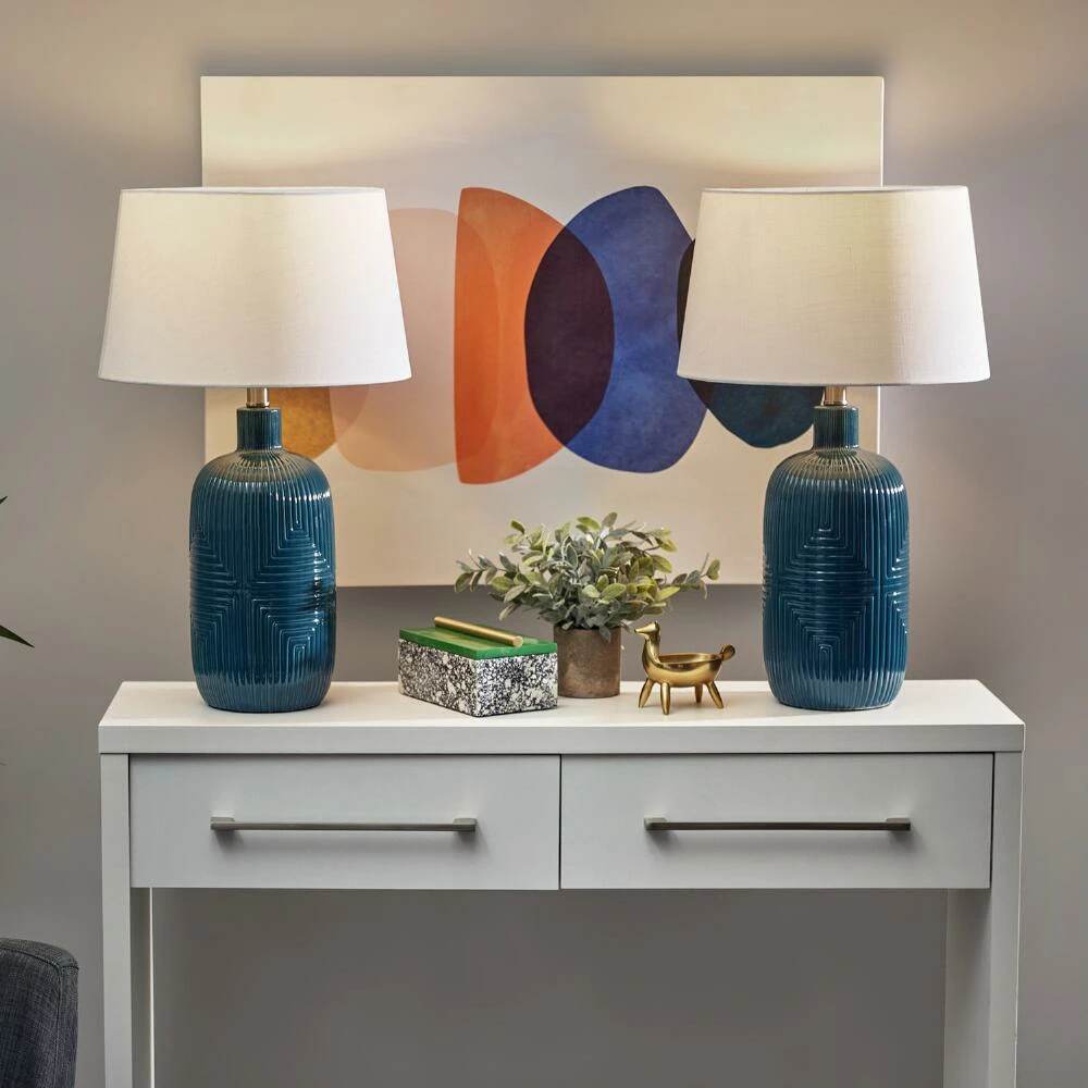 Give your home a pop of cool dark-turquoise color and cozy light with this set of Maisie table lamps. Designed by Adesso, their ceramic bases are textured with vertical and horizonal ribbing forming a unique diamond pattern. Whether you spread them about your home or pair the two together, this matched set of table lamps topped by white drum shades gives your space the perfect ambient glow.