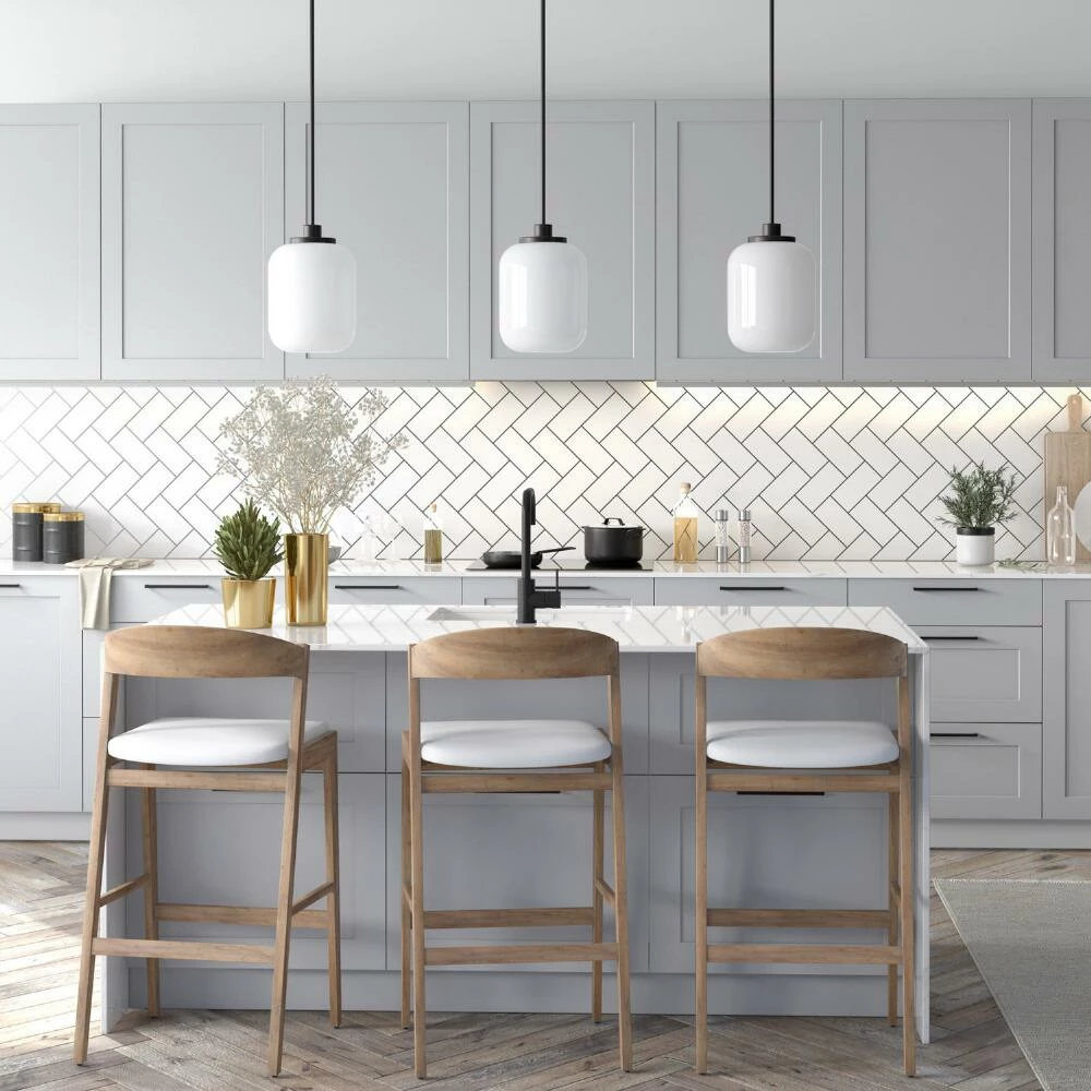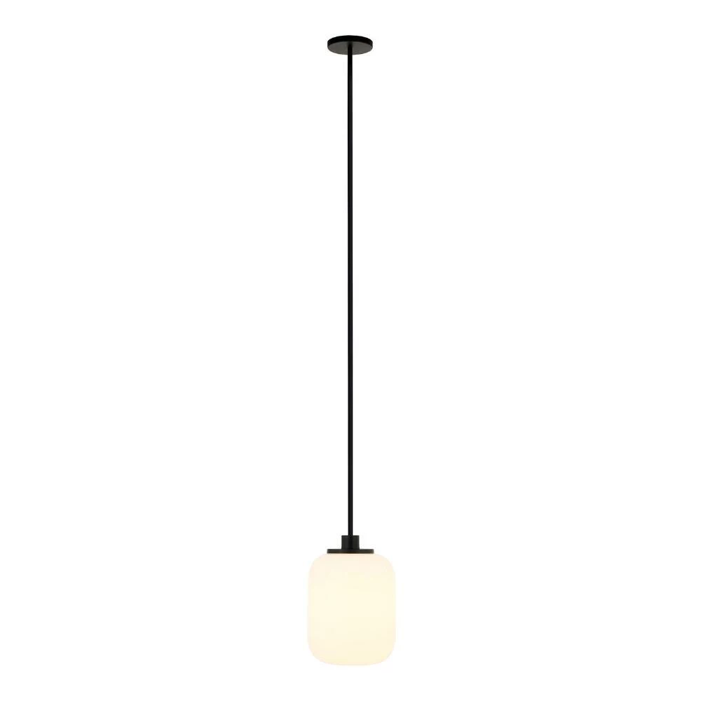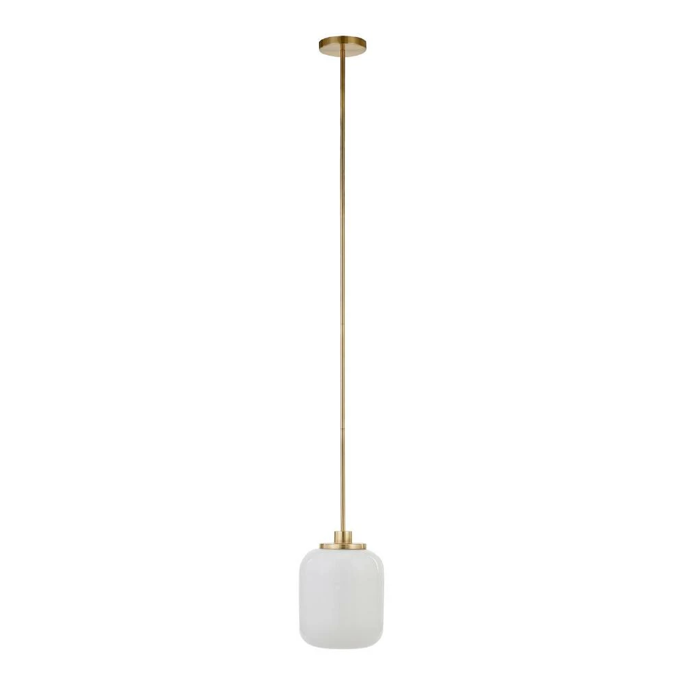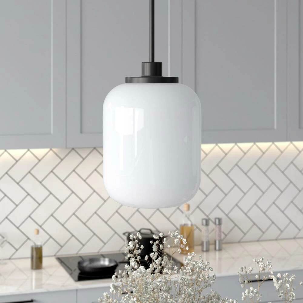 The minimalist sophistication of the Marina pendant lamp pairs a jar-shaped white glass shade with a metal rod and ceiling cap in a choice of finishes. Lighting up with the bright glow of vintage-inspired milk glass, this cylindrical hanging lamp updates the kitchen, dining room or living room with a chic retro vibe. Style it in blackened bronze to emphasize its industrial flair or in golden brass for a luxe touch of warmth.