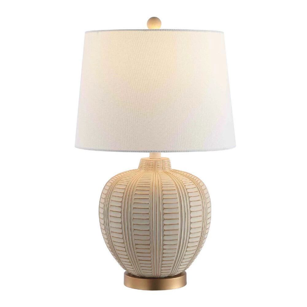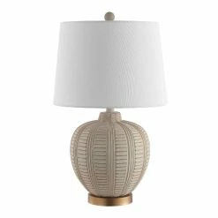 The shapely body of the Marla table lamp is defined by its textured horizontal and vertical ridges. Set atop a gleaming rose-gold base and topped with a white cotton shade, this contemporary lamp from Safavieh adds dimension to your decor.